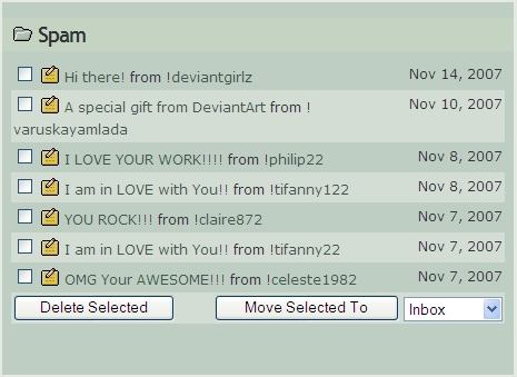 Here's my spam. Yep, as it turns out, hot internet chicks want me for my art. Also, philip22. The little exclamation points before the names mean that the users have all been banned. All deleted.