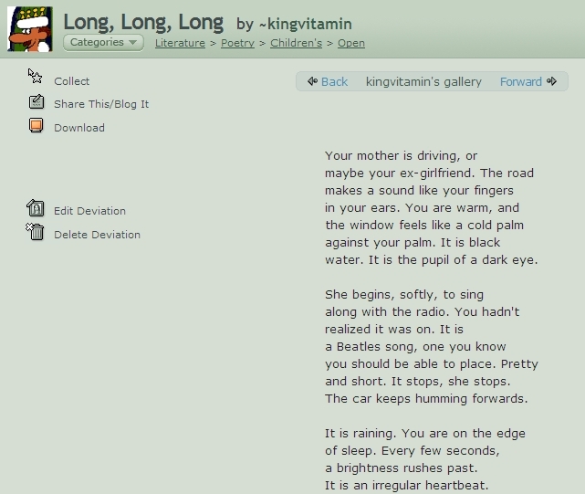 So. I used to fancy myself a bit of a poet. Read a little Eliot, a little WCW, and decided that, since my parents wouldn't get it, I needed to share some shards of my soul with the Internet. Did some looking around, and found good old DeviantArt dot com. From fall 2002 through late 2005 or so I spent quite some time on the site, uploading Deviations, browsing galleries, posting on forums, participating in hilariously pointless protests. Over this period of time, I worked on my English degree at college, reading and writing poetry rather extensively. Gradually, my skills improved, and I came to notice that, well, with very, very, very few exceptions, all writing on DeviantArt sucks. I still used my site as a storage unit, but stopped paying attention to comments and favorites. Eventually, I stopped bothering with that, and my page lay completely dormant.