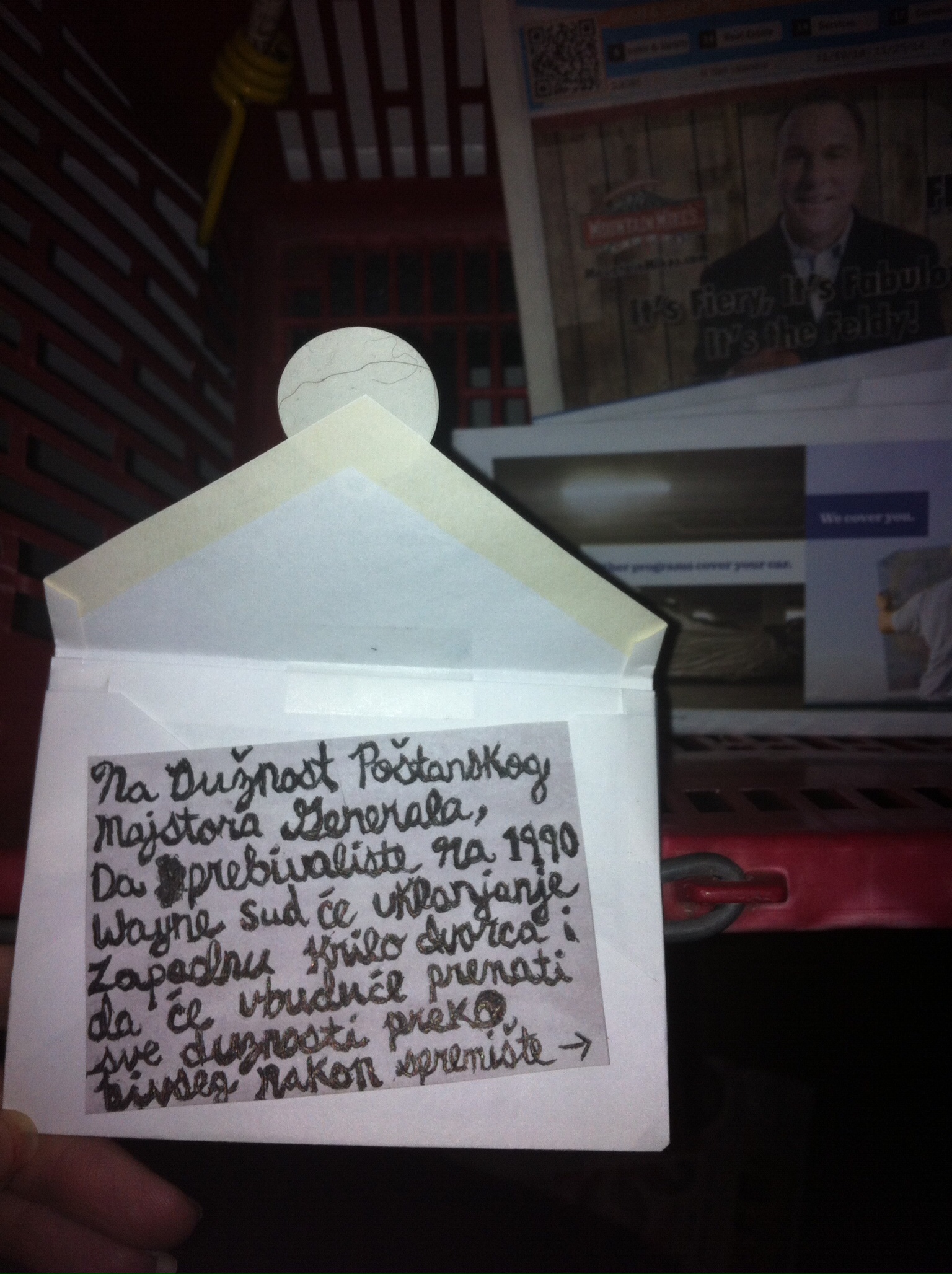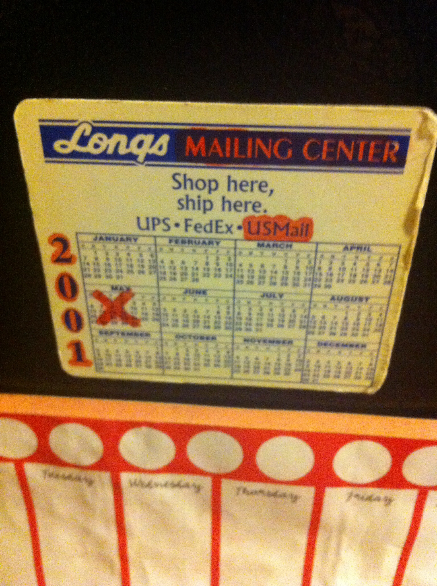 A red X on May 8th, and some more red outlining "Mailing Center", "US Mail" & ... "2001"?