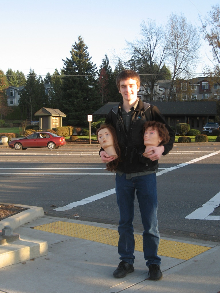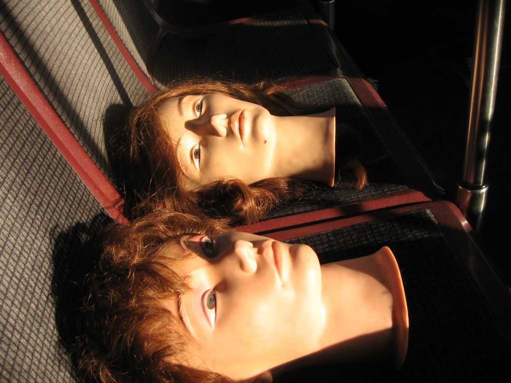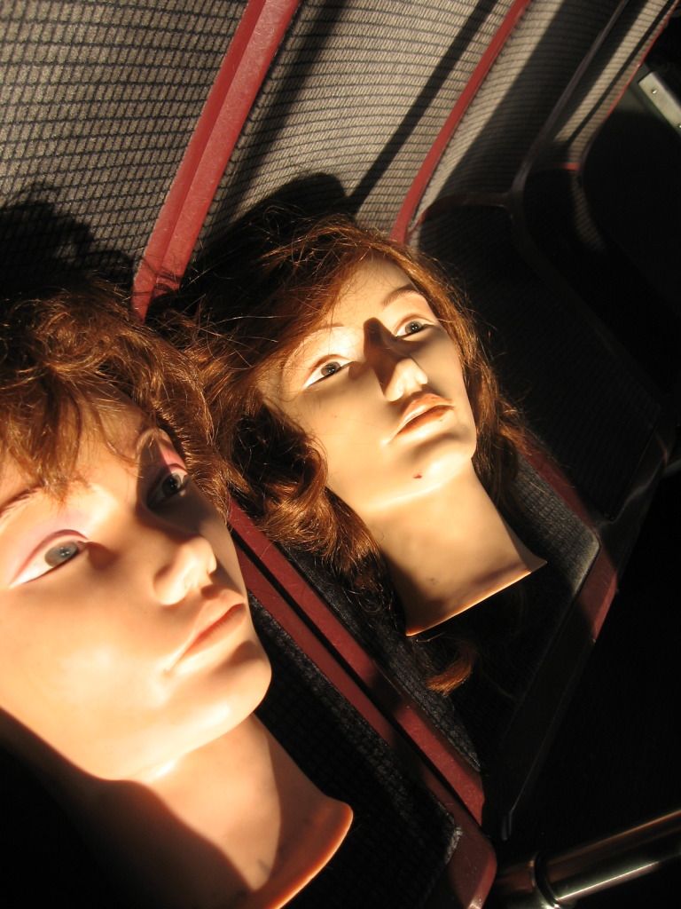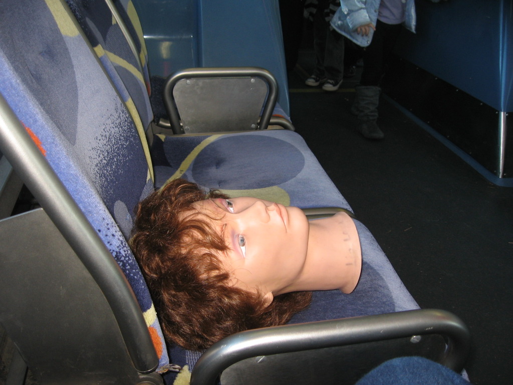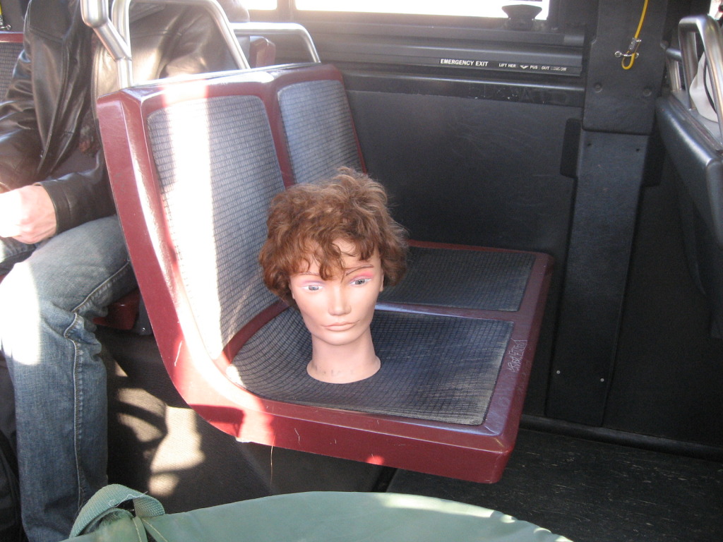 Hmm... we have a problem. They think I'm a student of hairdressing. I'm not. So, of course, I pulled out a head and placed it on the seat next to me, to break any illusions they may have had that I am a normal, sane individual. (see photos) As the bus filled up (I had started at pretty much the beginning of the line), the seats around me for some unfathomable reason remained empty. Finally, though, the seats were all full except for the one the head was sitting in, and the one next to it. An elderly gentleman boarded the bus and sat down in the remaining seat next to the head. A few minutes passed, and he looked down. The obvious startlement on his face, and the subsequent attempt to get away was hilarious to behold. After a quick survey around the bus, the poor soul realized that there was nowhere else to sit. Inching himself as far away from I and my multiple heads as he could, he avoided my vaguely interested gaze. In a few stops, a seat was vacated, and he sprang to his feet and sat in it before anyone else could take it.