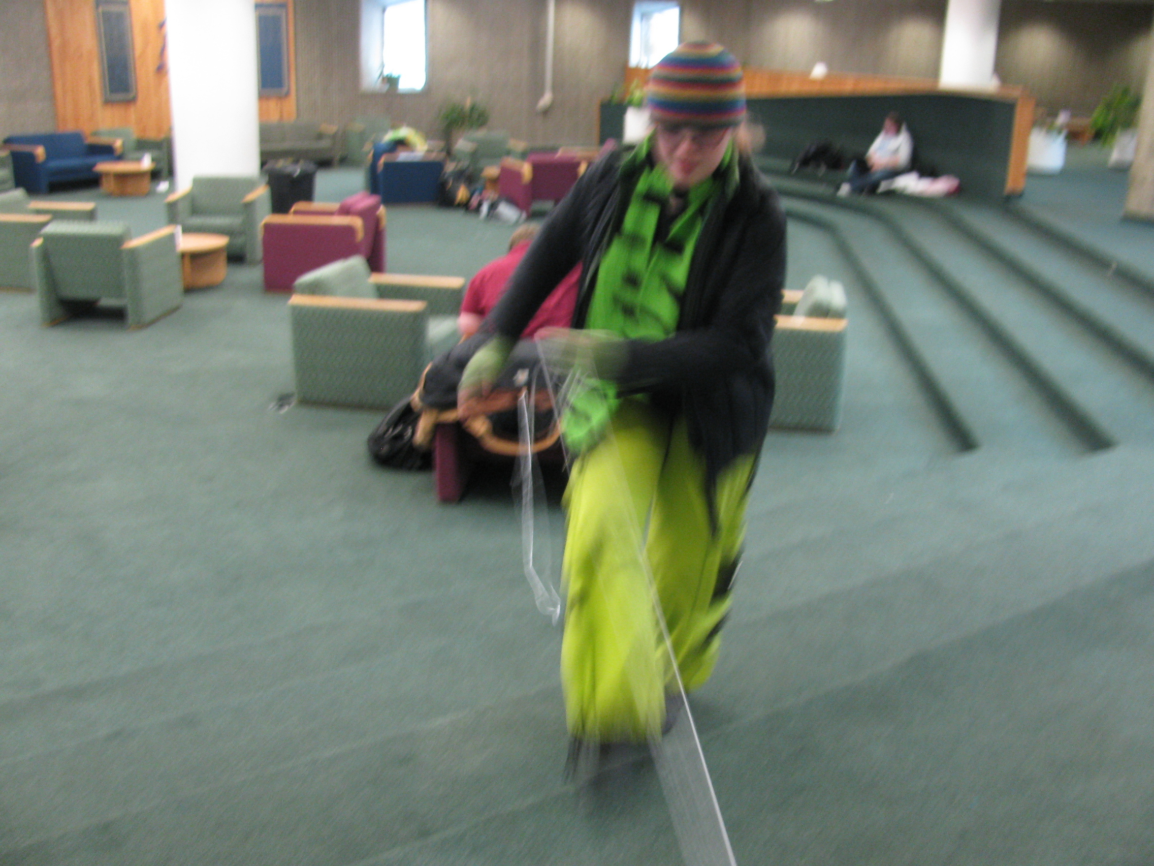 This was unacceptable. I decided to stick around and try again. I was rewarded soon when a bookworm sat down in the middle of the multilevel lounge all alone and set to work on his studies. I gathered up the abandoned yarn and snuck up behind him feeling like a million bucks – in the pocket of a master catburgler. Unfortunately, once I had the string tied I noticed that it was tangled up down the line. I stepped away and tried to get it unknotted but after a few moments I gave up and walked off to keep from getting noticed. I waited for someone else to sit down close by, but no one did before the Bookworm was finished with his study and packed up to leave.