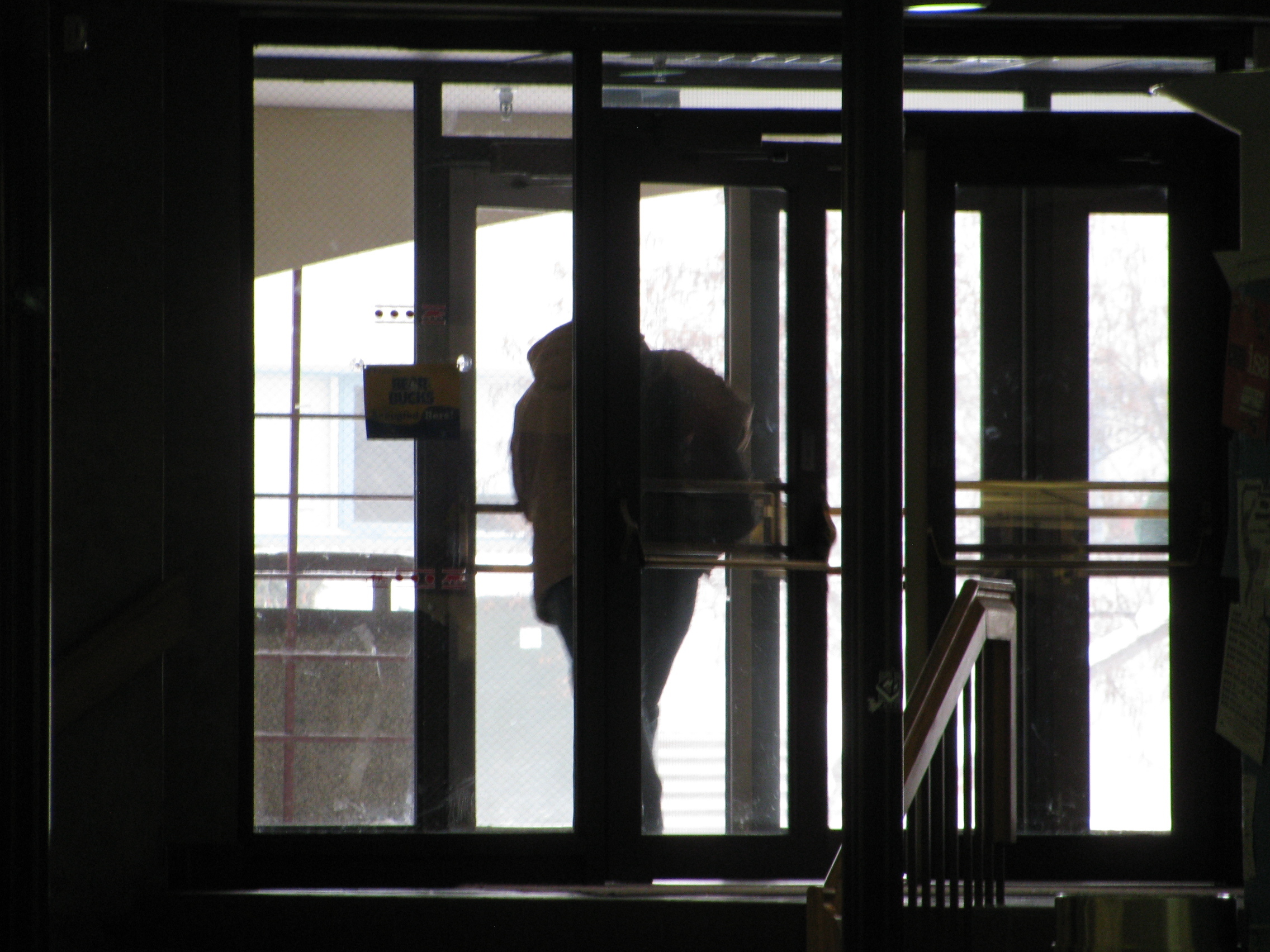 I started with a large spool of white yarn in the Wood Center – a gathering, waiting, and studying place for students. Looking around I was impressed by the caution of my fellow students. Most were completely immune to being snuck up on. Then I spotted Fat Guy #1 and Fat Guy #2 sitting back to back… across the building from each other.