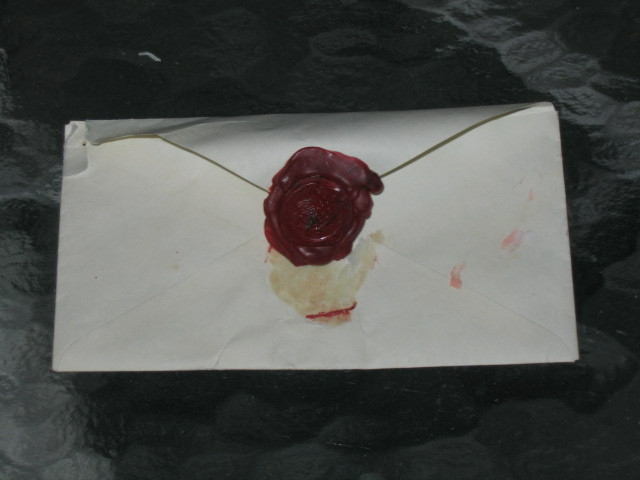 The letter is a store-bought parchment penned in India ink. The paper is folded into an envelope shape, sealed with red wax and stamped with a generic stationary stamp. A nice little gesture really.