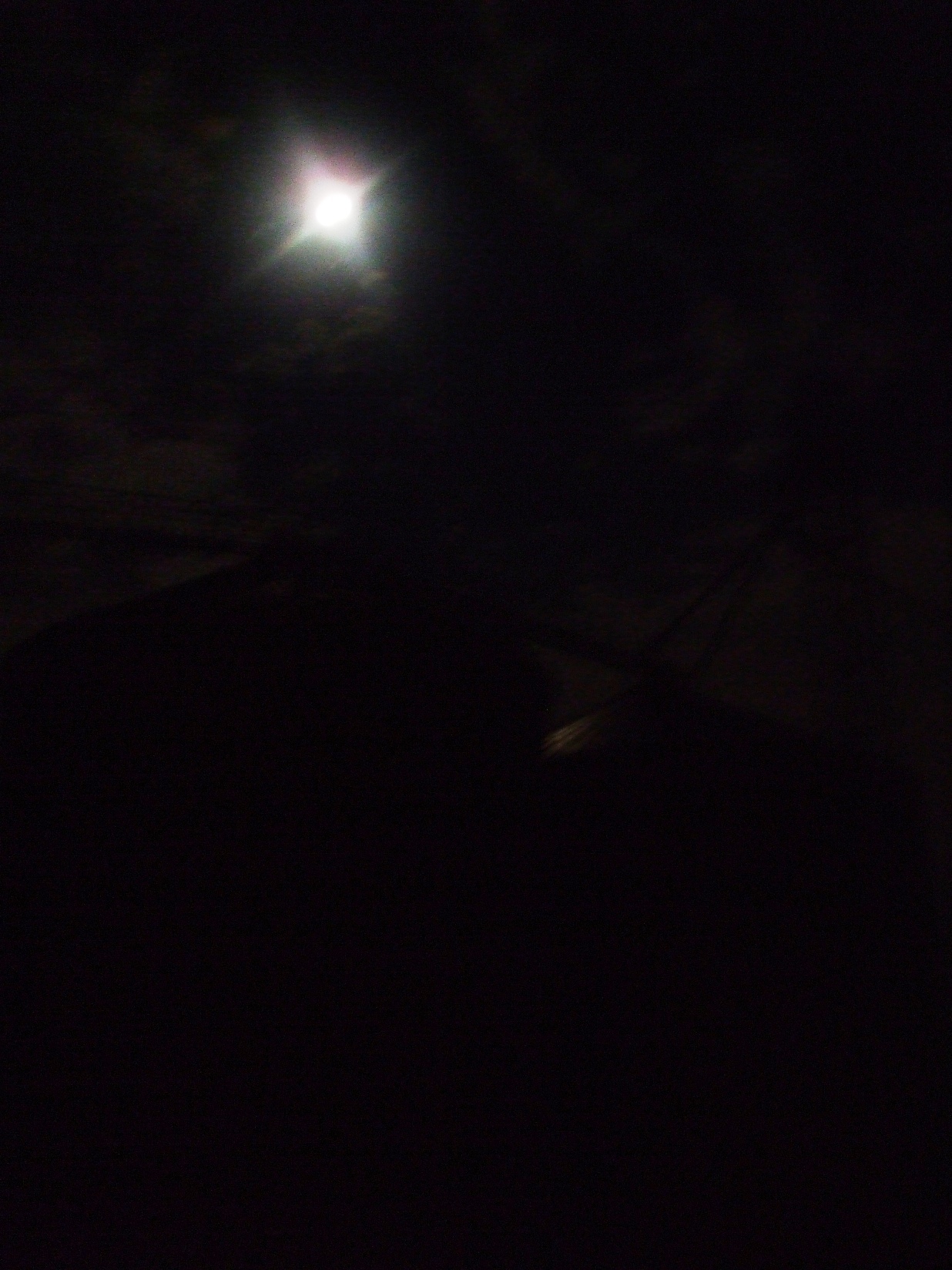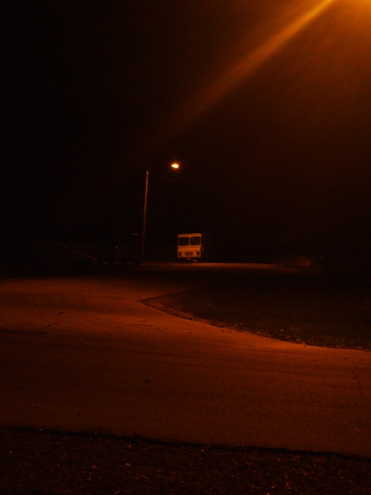 We've just left our road to cross Giddings Street, the spine of Kelley (the only road in or out of the town). That light is a car coming, probably someone coming home from Ames since we rarely get people driving through.