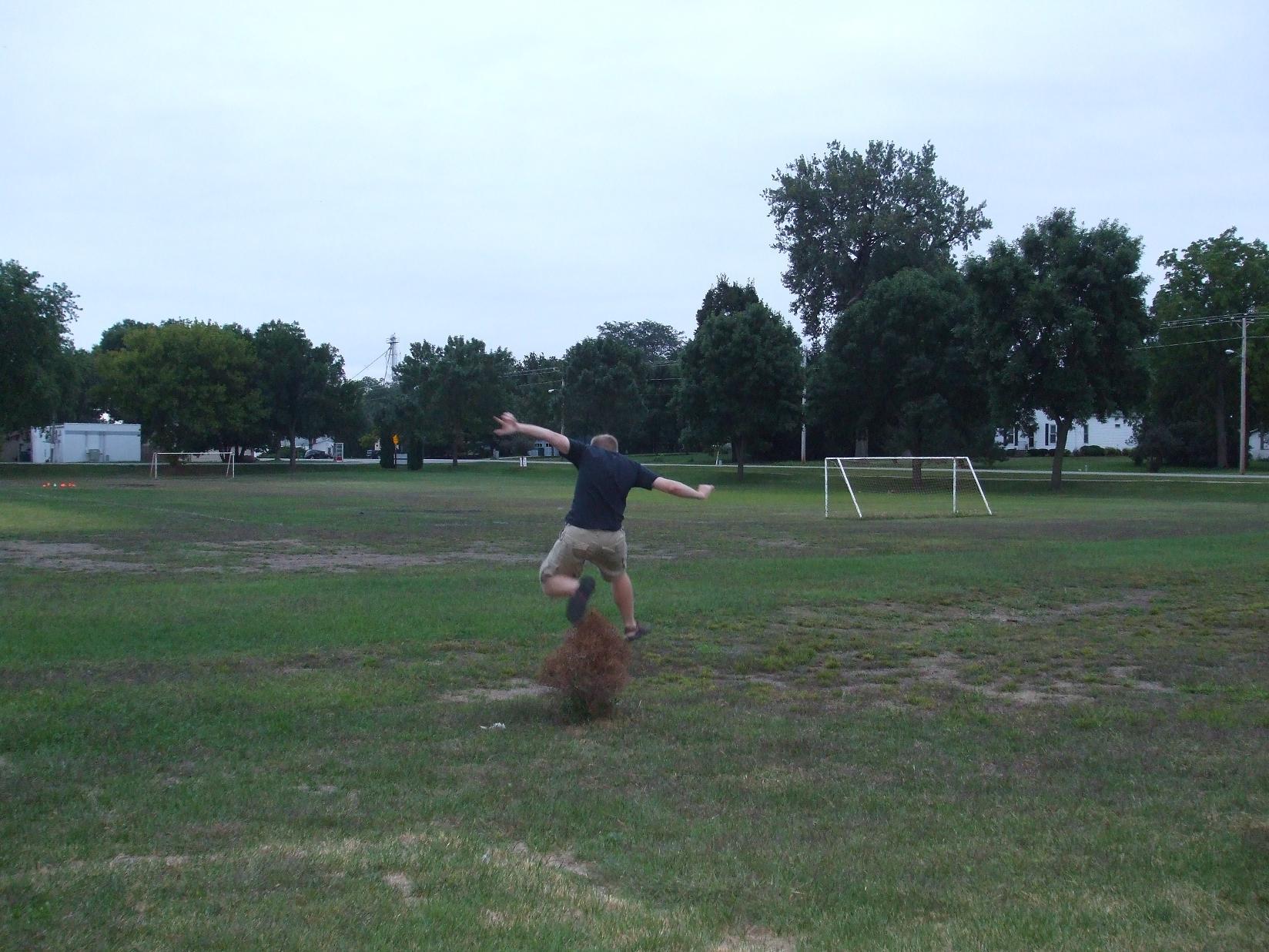 As expected for a first attempt, I failed to reach the tree in time before the camera clicked. Not only did I not reach the tree in time but I soon discovered that one of our "small" trees was now just a little higher than my waist. I quickly aborted the jump (not wanting to rake my neuticals across the tree as I would surely have not made it). Brushing off the sweat from a near embarrassing experience, I went back to reset the timer on the camera. This time I chose a much smaller tree (measuring up to my knees) and made attempt number two.