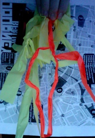 At about 7pm I arrived at Alexanderplatz (as the flyer advised), but couldn't find a crowd or anything suspicious looking. Called a friend, to check the Website written on the flyer, there it said: "Funkturm, Alexanderplatz". So I went over and found 60 to 70 people listening to a megaphone, barking instructions. I got my red and yellow ribbon and a piece of paper telling me where to go and by which rules.