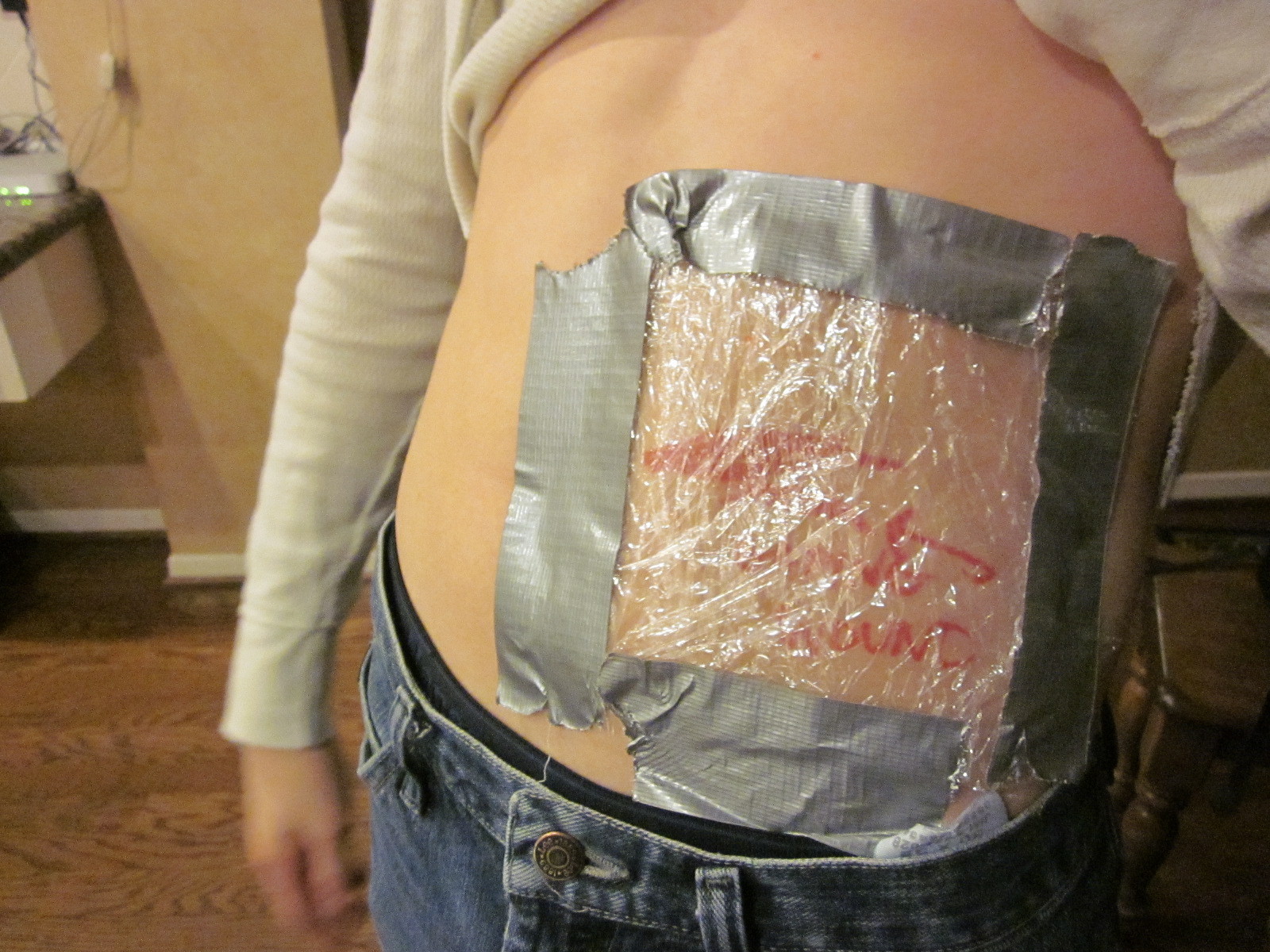 If your friend has managed to eviscerate himself in the process of obtaining the Gaping Wound, there's a slightly different set of instructions involving saran wrap and a large amount of duct tape, but that will be covered in next week's survival guide.