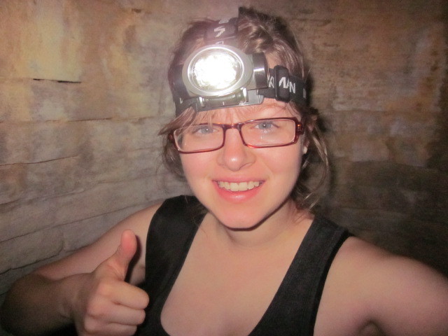 So I crawled down this tiny little tube, the size of which isn't really apparent here, with my backpack catching against the top of it and my flashlight banging against the cement each time I moved my hand. . .