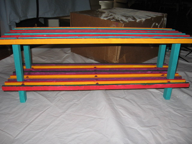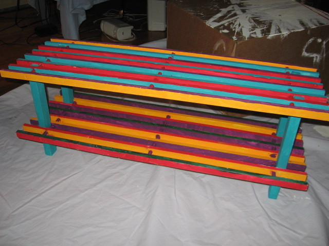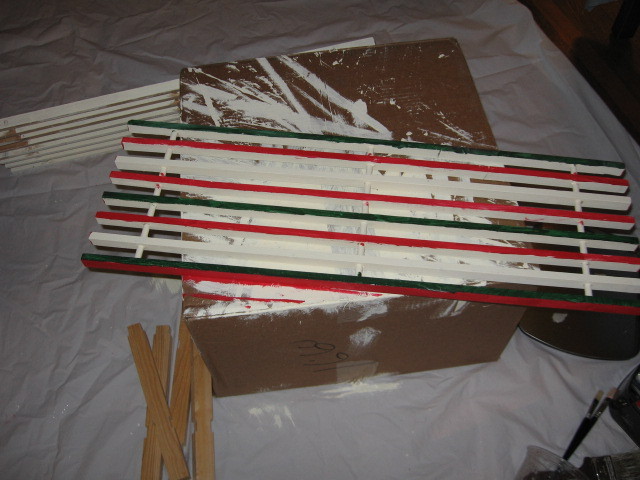 Later I put more colors of paint on the top rack, finished bewhitening the bottom rack, and started on the supports. I needed more of that satin cream color to finish the base coat, so while I was at the craft store, I bought myself a few wacky bright colors, since most of my craft paints are pretty plain primary colors.