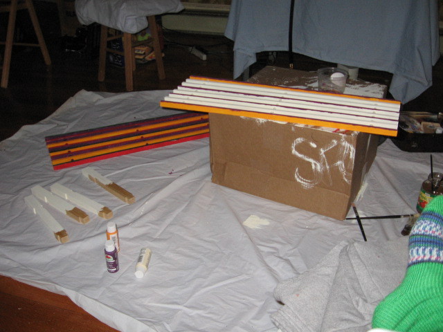 Update at the end of first session: I didn't think about how much surface area this damn thing has. Whoa. And how hard it is to paint a lot of SMALL surfaces evenly. When I'm tired. Oh well. I think if I make enough blocks of color, it'll still look okay. the point is that I fixed the breaks and that some paint will make the whole shebang hold up a little longer.