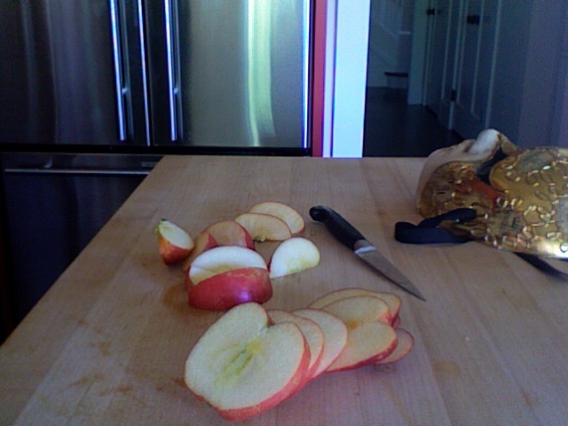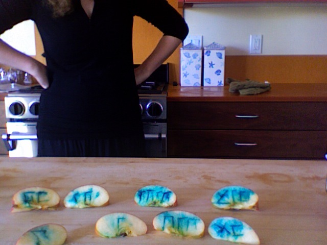 I'm fasting more as a hack-your-own-brain gesture, and that is pretty sucky, so I cheated a little: one slice of one apple. The one that says "tzum" or "fast". Sacrilicious.