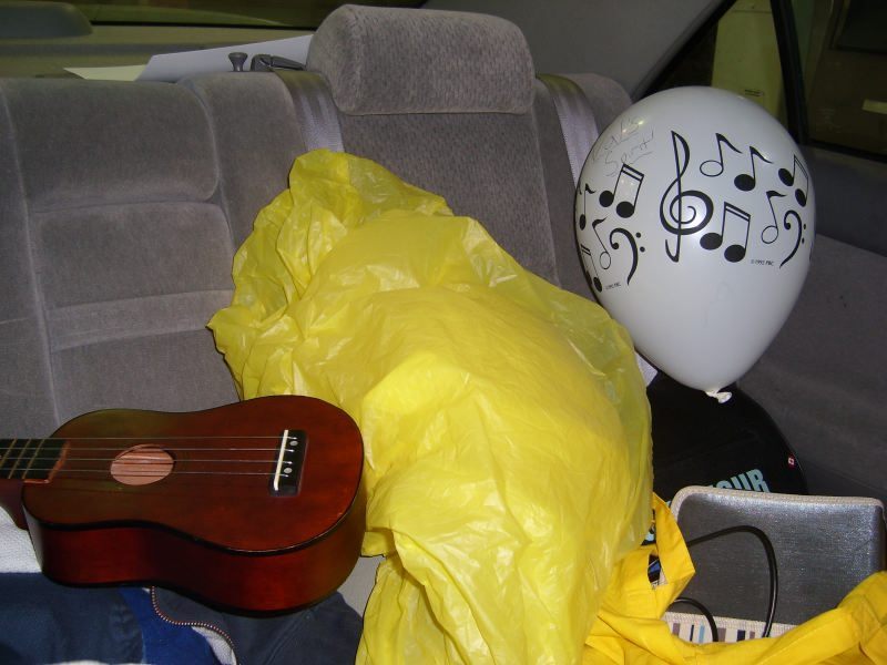 The middle yellow number is a poncho. But this was half of our backseat, before the snack shopping. To the right is the balloon containing Val's (Crazy Child's) Spirit! She was with us in spirit, and on the phone when we got lost. All the way from Canada, no less.