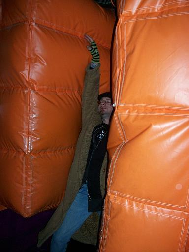 We ran around running into the bags for a bit again. Cris suggested that if the dancefloor at Neo (a Chicago Goth Club) had the same set up it would make dancing a hell of a lot more interesting. After that we went into a room that had a projection on the floor that had all these balls of flame. You had to run around the floor stomping on the flameballs to get them to go out. We did that a bunch of times, still laughing like crazy. I think the best time we got was 48 seconds.