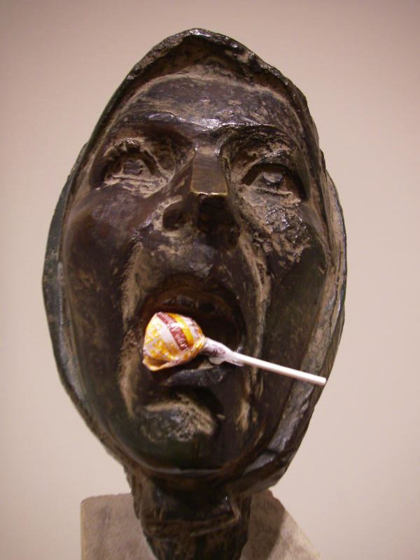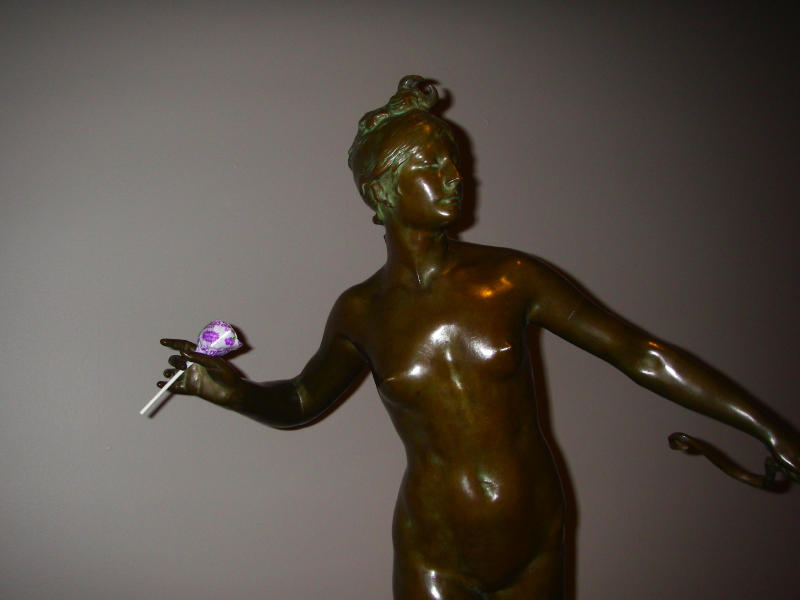 I found the bust in a corner of a room right below a camera and figured it out of even a fish-eye angle of sight. The small sculpture was in an anteroom which seemed to be free of cameras. I'd intended to leave the candy where placed, but since both these pieces were small, and I could see someone toppling them attempting to remove the suckers, I didn't leave them in place.