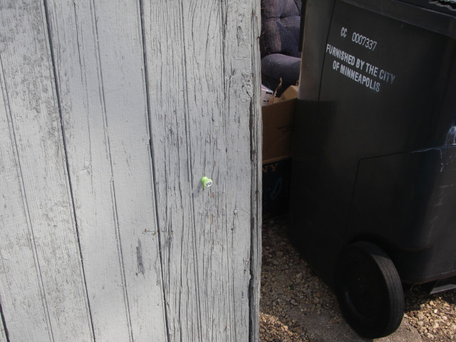 Where to place the pins has been a question. I had no problem with sticking one in the side of a beat-up garage and another in a tree beside a dumpster, but I couldn't bring myself to put one into a freshly-painted fence. As for dumpsters with no easily stick-able things beside them, I've pressed the pins into asphalt (don't yet know what I'll have to do if there's only concrete around one).