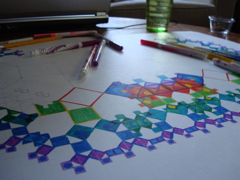Hard at work again. It's hard to see the detail in these pictures but each different size square in each generation has its own pattern, and when the boxes overlap their colors change in very interesting ways.