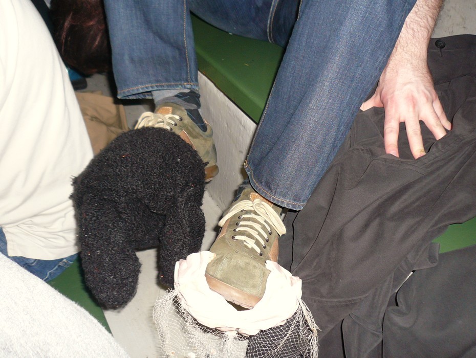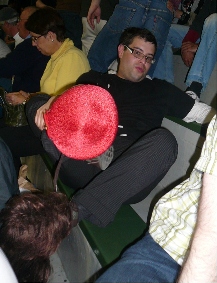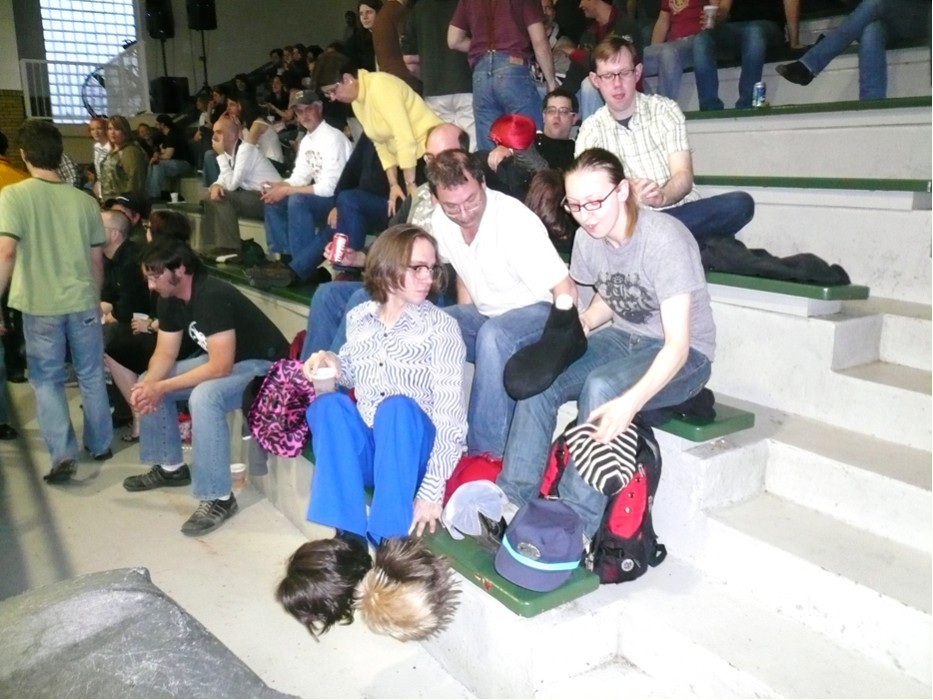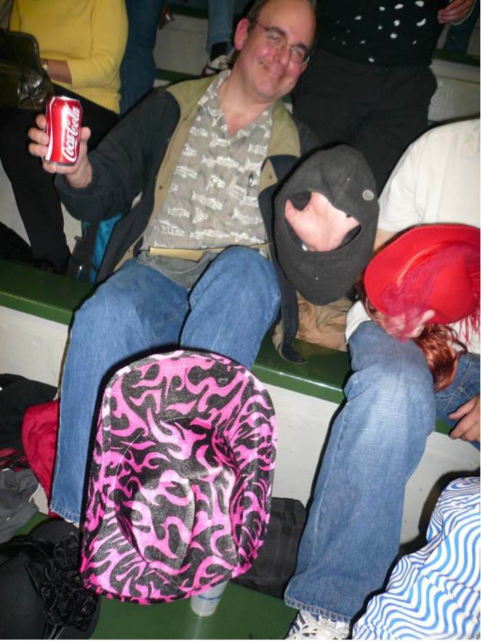 I arrived at the the Cicero stadium for the Roller Derby bout. By half time I had gathered enough willing participants to put a plan into action. My entire hat collection did not belong at the Roller Derby bout particularly. More importantly, hats do not belong on feet, so here is my entire hat and wig collection displayed on the feet (and a few hands) of Roller Derby fans in the stands (some i knew before, some i just met). The one tricky part was the new hat. It is a shoe hat, meaning it would look appropriate on either head or foot. So i had Meridithian coddle it like a baby. I did not catch her at a particularly maternal moment, but it will have to do.
