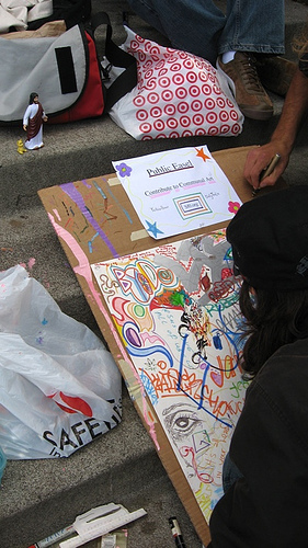 Unfortunately for me, this was the last time I saw my Plastic Jesus. My bag was stolen from me in the bar that night. The first wave of terror set in when I realized that all of my ID, credit cards, cell phone, and ipod were gone. I quickly canceled all of my credit cards and bank accounts. Seeing that I had been drinking quite a bit, it was a nice surprise to find that YellowBear was out and about and happened to be about 5 minutes away from me. He graciously agreed to pick me up. While I waited for him to arrive, I looked up to see Lowtech strolling down the street...he kindly gave me his condolences and asked me if I wanted a burrito. Once YellowBear arrived, he immediately took me out for a shot of Jack Daniels which solidified my drunkeness. I passed out on his couch and awoke to the horrible realization that both my red superhero cape and my Plastic Jesus had been snatched along with my bag. My heart sunk to my toes. He had been my buddy for such a long time...he had been on most every crazy adventure with us and now he was lost.