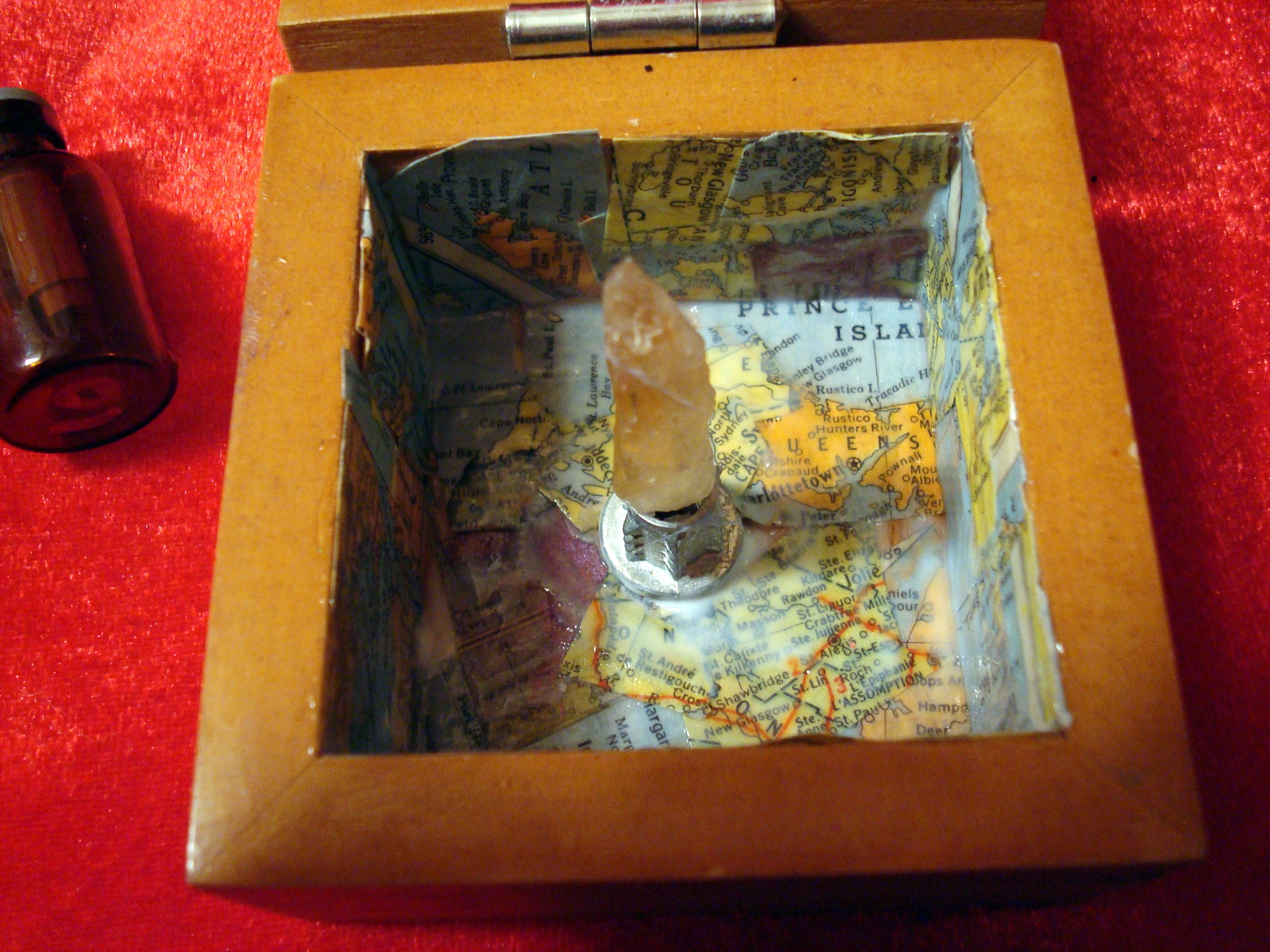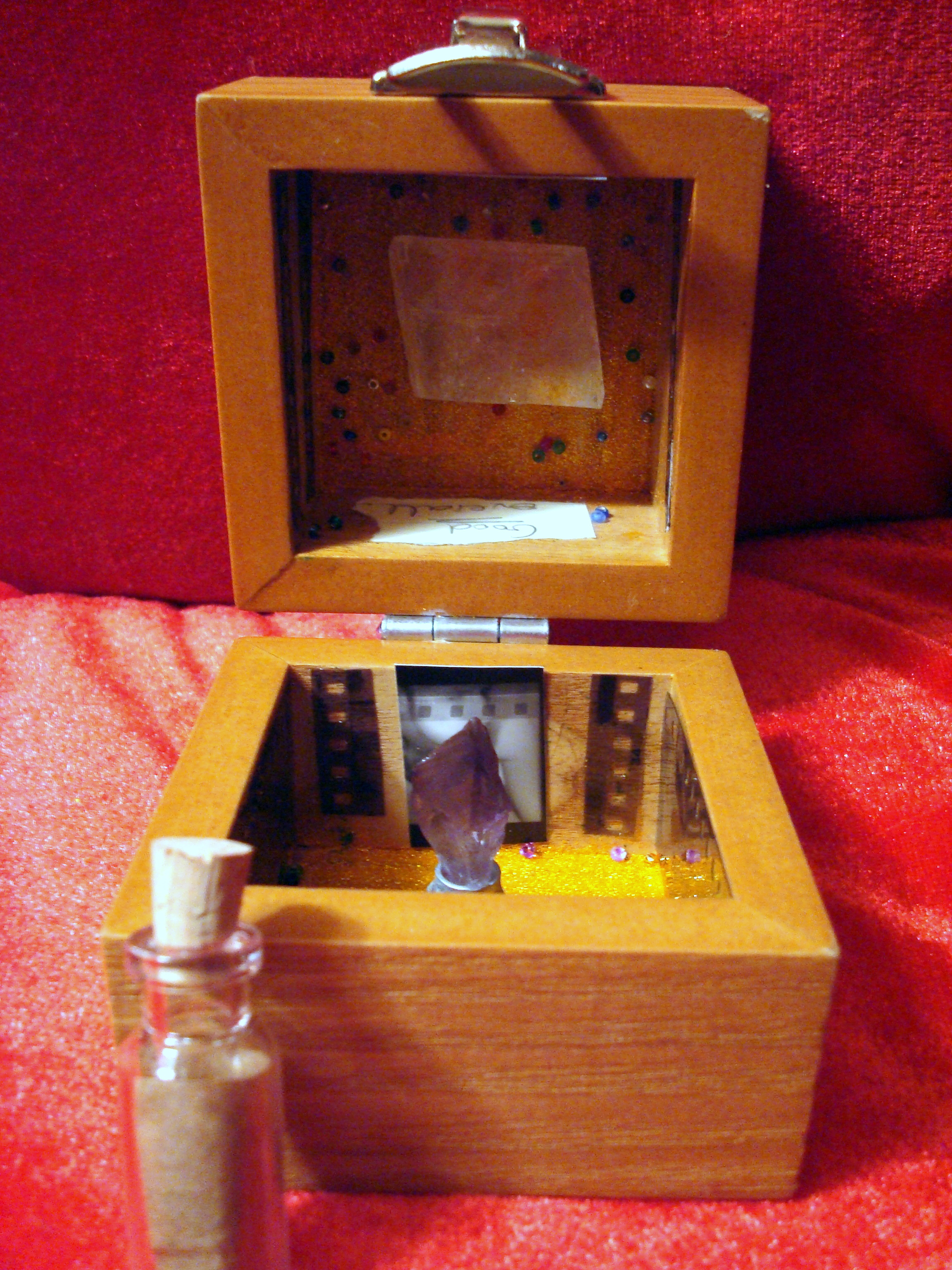 And with the addition of a few items: marble stars, chalk, stamp dust, metal hinges, broken mirror, light bulbs, stone egg, glitter (of many colors), felt, embroidery floss, metal clasps, metal feather, torn up maps, crystal quartz (of many colors), film negatives, glass bottles, mica, agate, oversized marbles, pendants, paint, obsidian arrow head, carved bone, sparklie gold rock, soldering iron, old photos, beads, paper bag, sharpie, glue, modge podge, and several weeks of my free time, these paperclip holders were transformed into dream boxes.