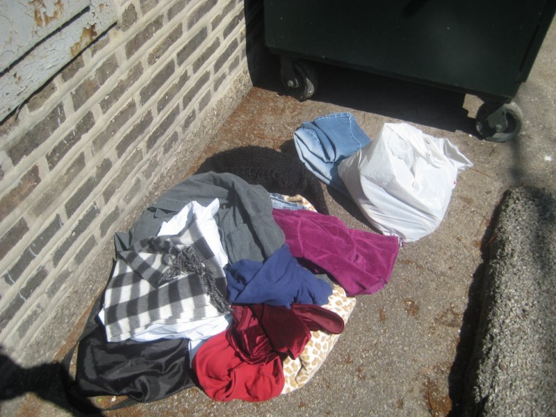 an entire trash bin full of clothes
