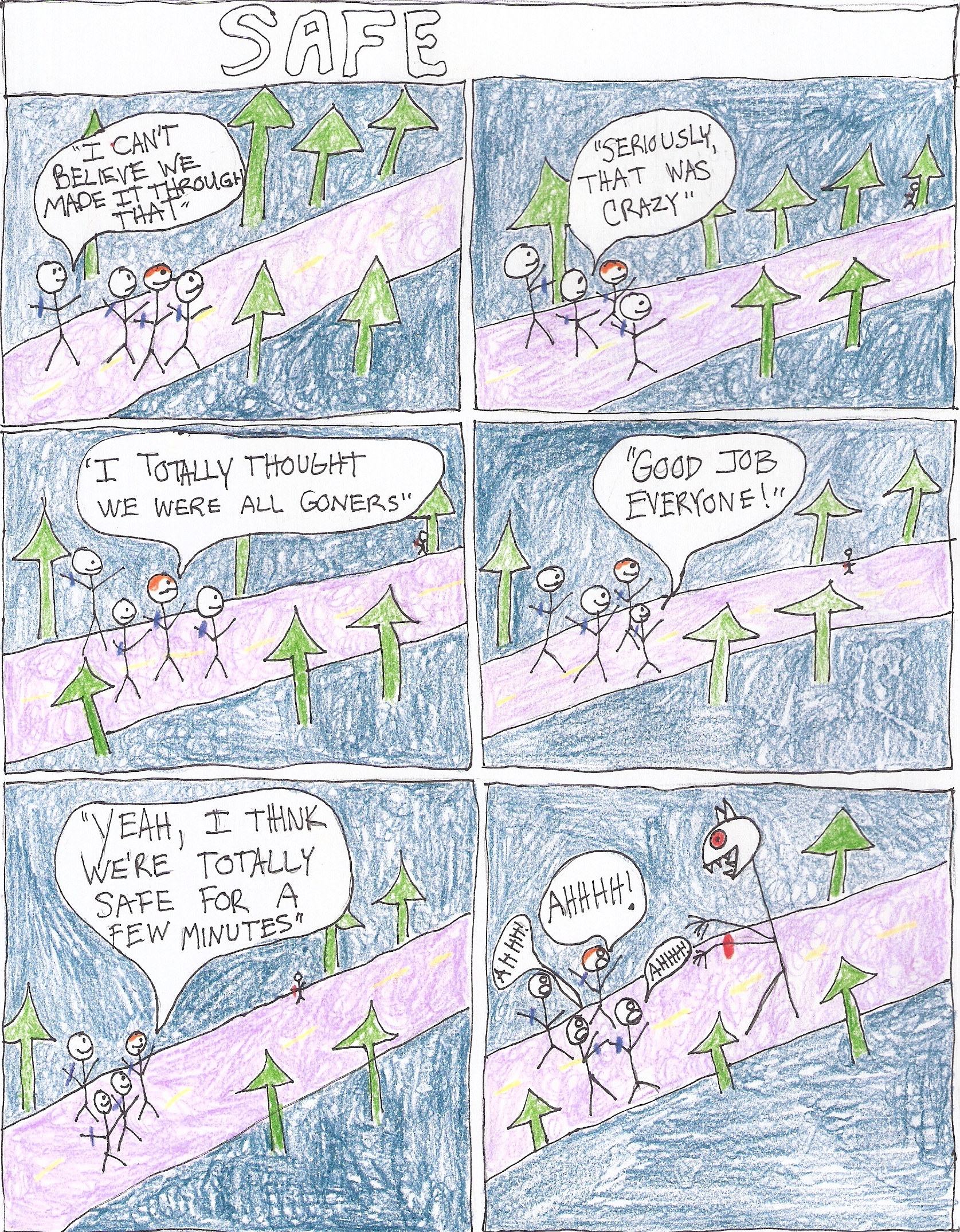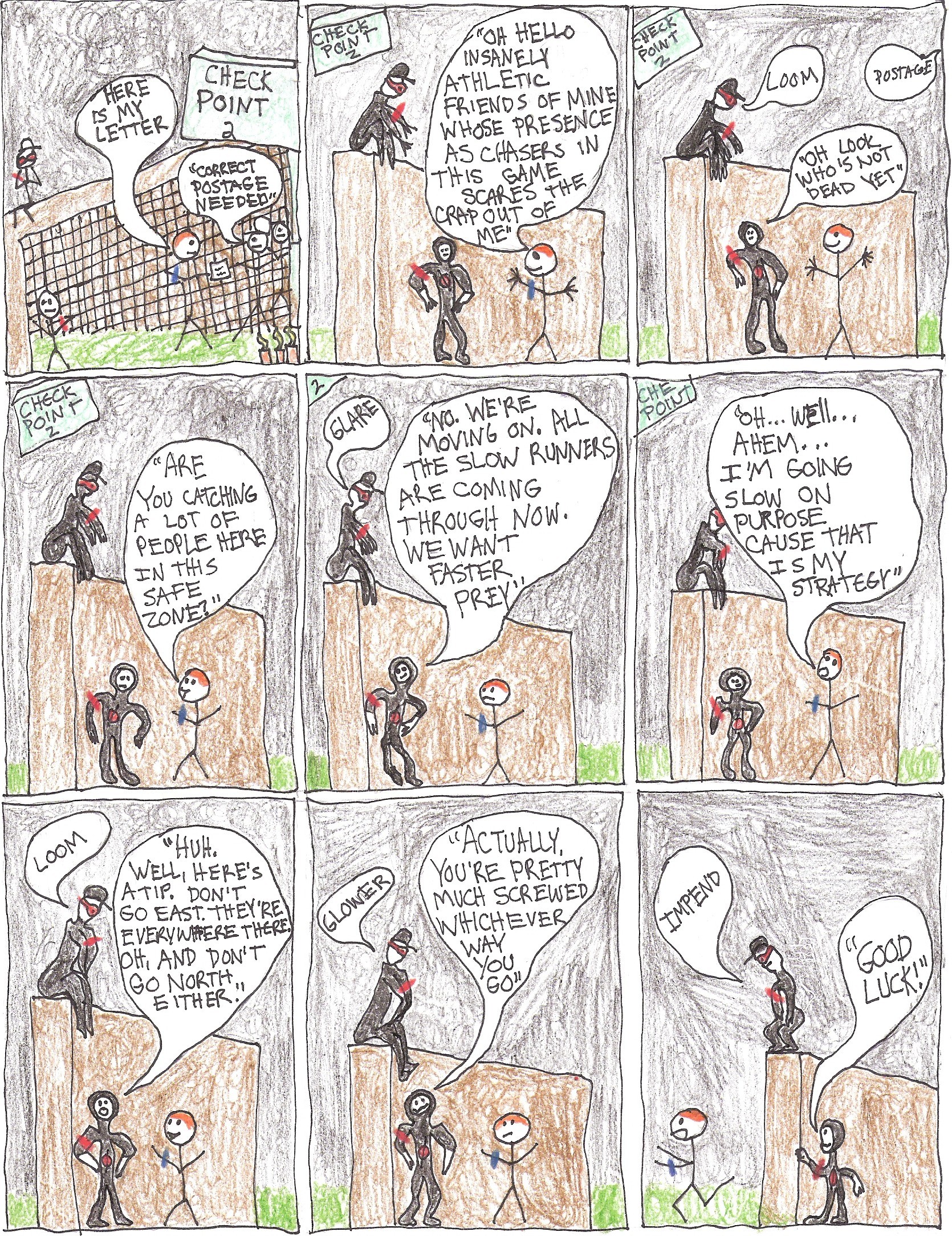 I especially love how the chasers are drawn as horrible animals with very sharp teeth and how they are lurking EVERYWHERE.
