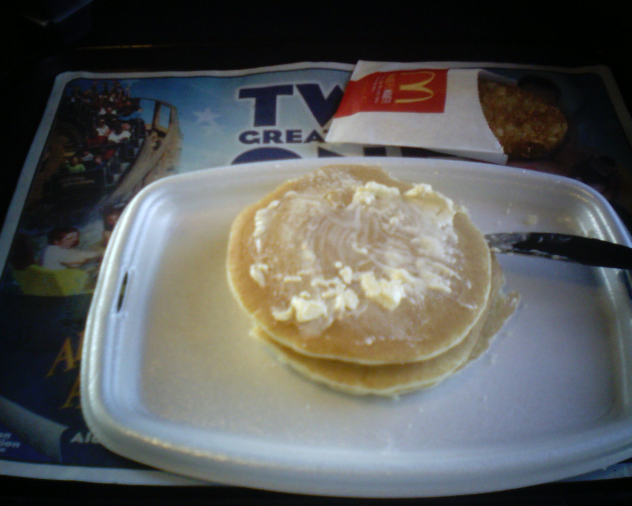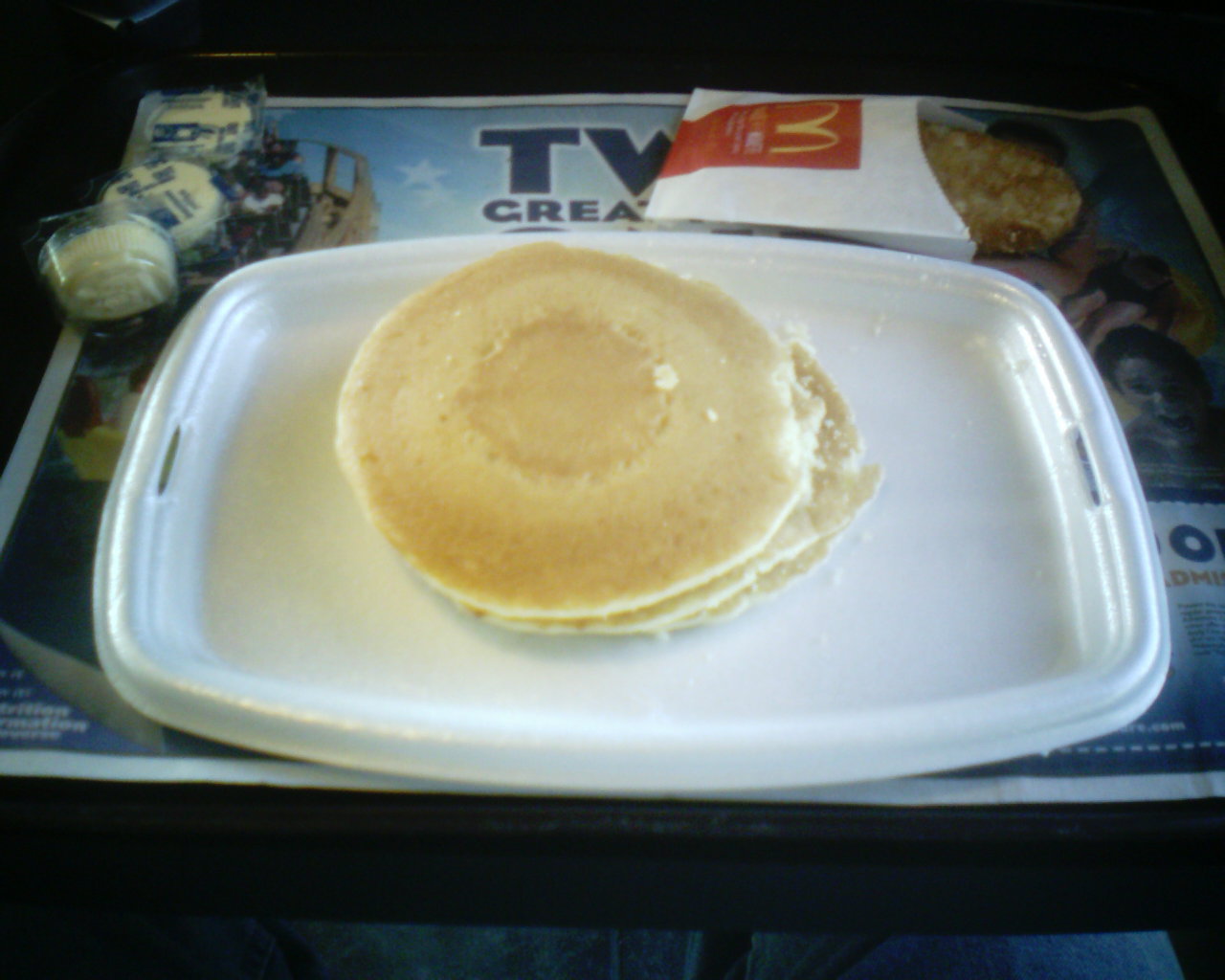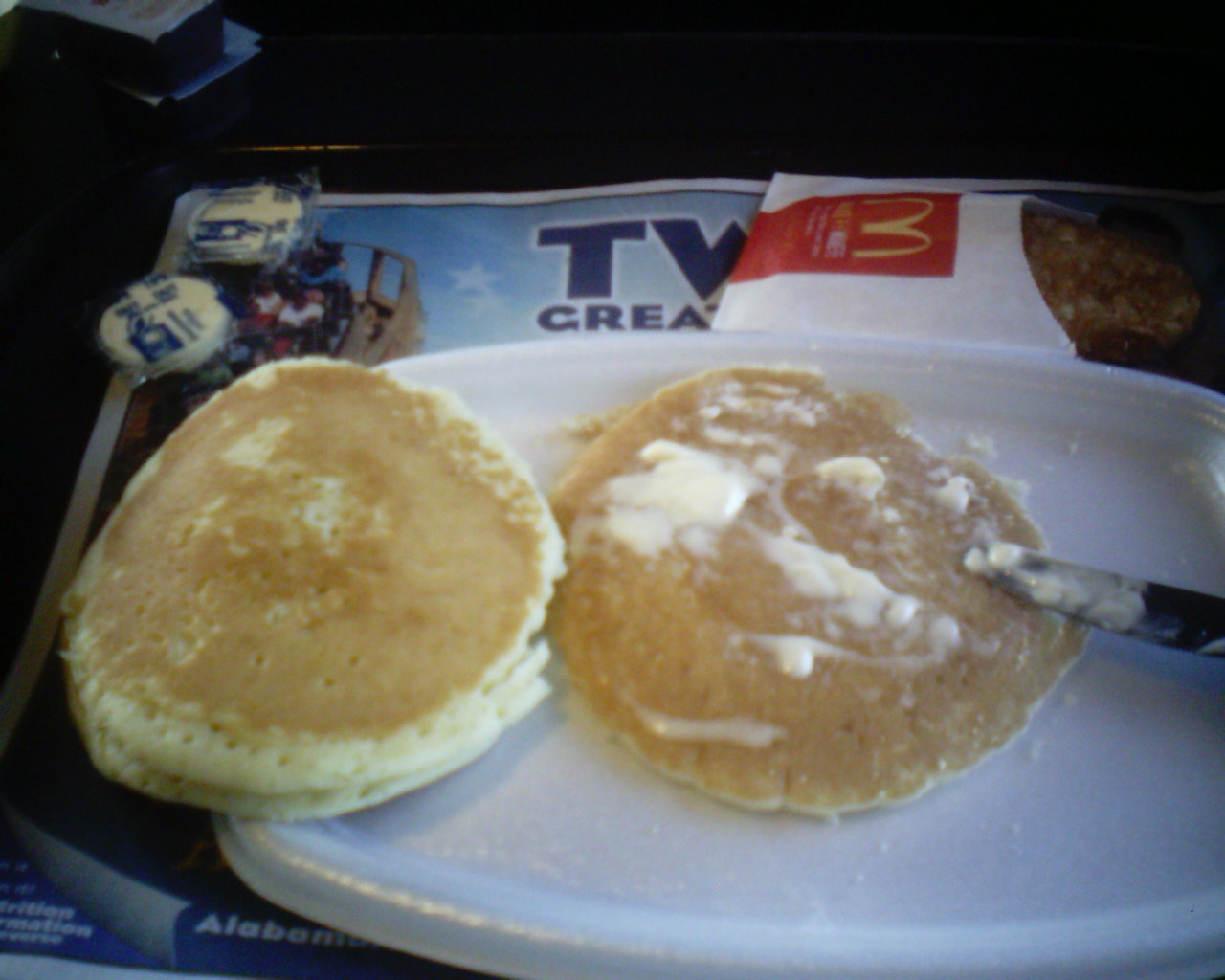Hotcakes, deep-fried hash browns, 3 pats of margarine, 2 tubs of syrup, and a cola.