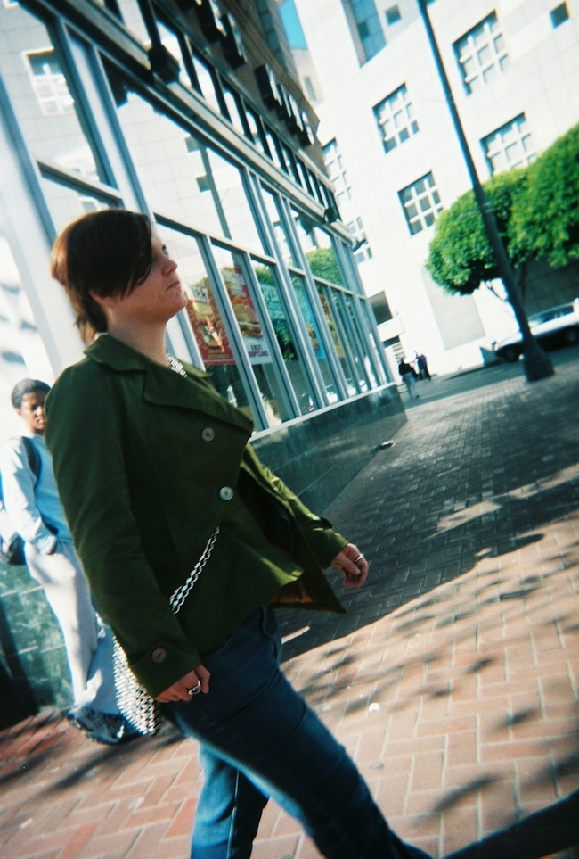 we roll into san fran. we walk into a fine curtain of water, across the street to walgreens and buy disposable cameras and cheap umbrellas. within three blocks my little flat shoes are soaked and i have no socks. we have no aim, no destination, no time limits, no appointments. i buy new boots at nordstrom's and leave my old ones in the box. the store is in christmas-colored chaos. new shoes trip and clutter the aisles and floors like rocks on a beach. we escape back into the rain, my feet dry and ready.