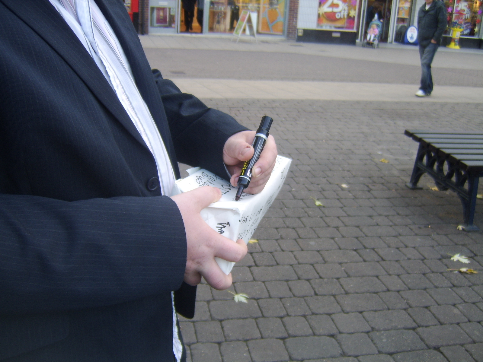 It was simple, they would walk around town with the giant 'it', asking people what they wanted to see made better in Great Yarmouth. These things would be written on the giant 'it', and would later be molded into the Forbes party manifesto. Then, the giant 'it' would be taken to the steps of Great Yarmouth town hall and left there to serve a reminder to the council of what Mr Forbes would make better, if elected. Mr. Forbes would then later meet up with Mr. George Mill, and watch the reactions of passers by.