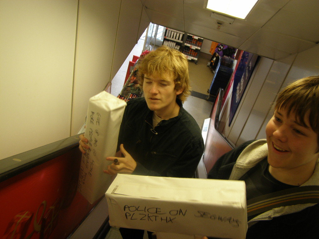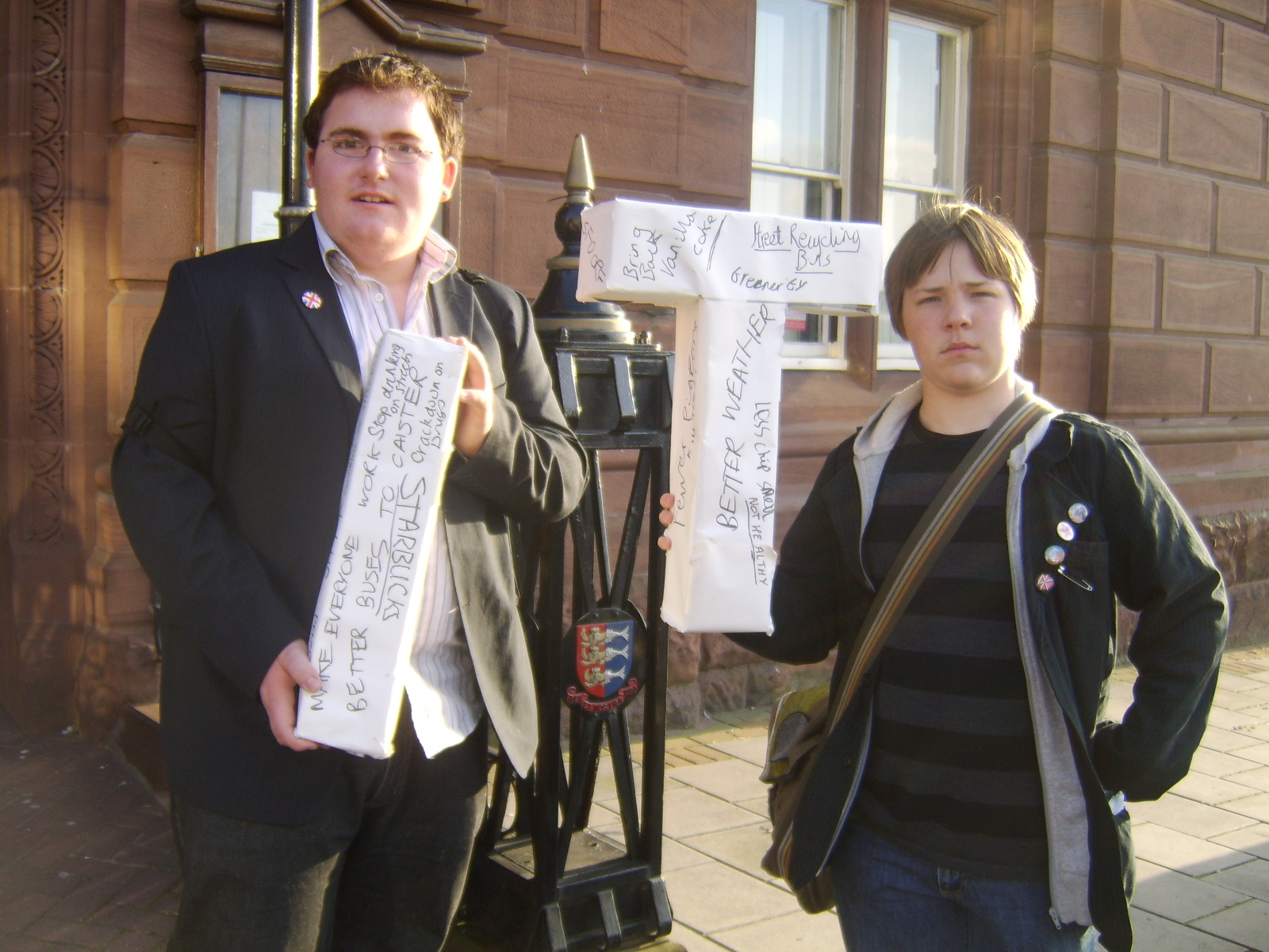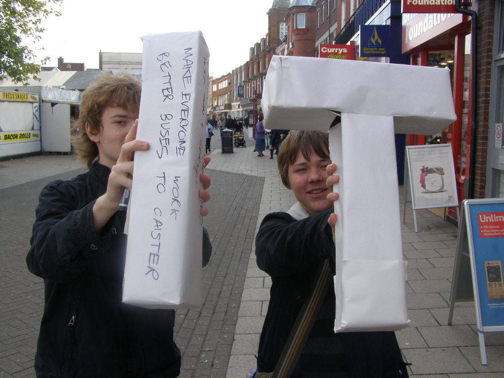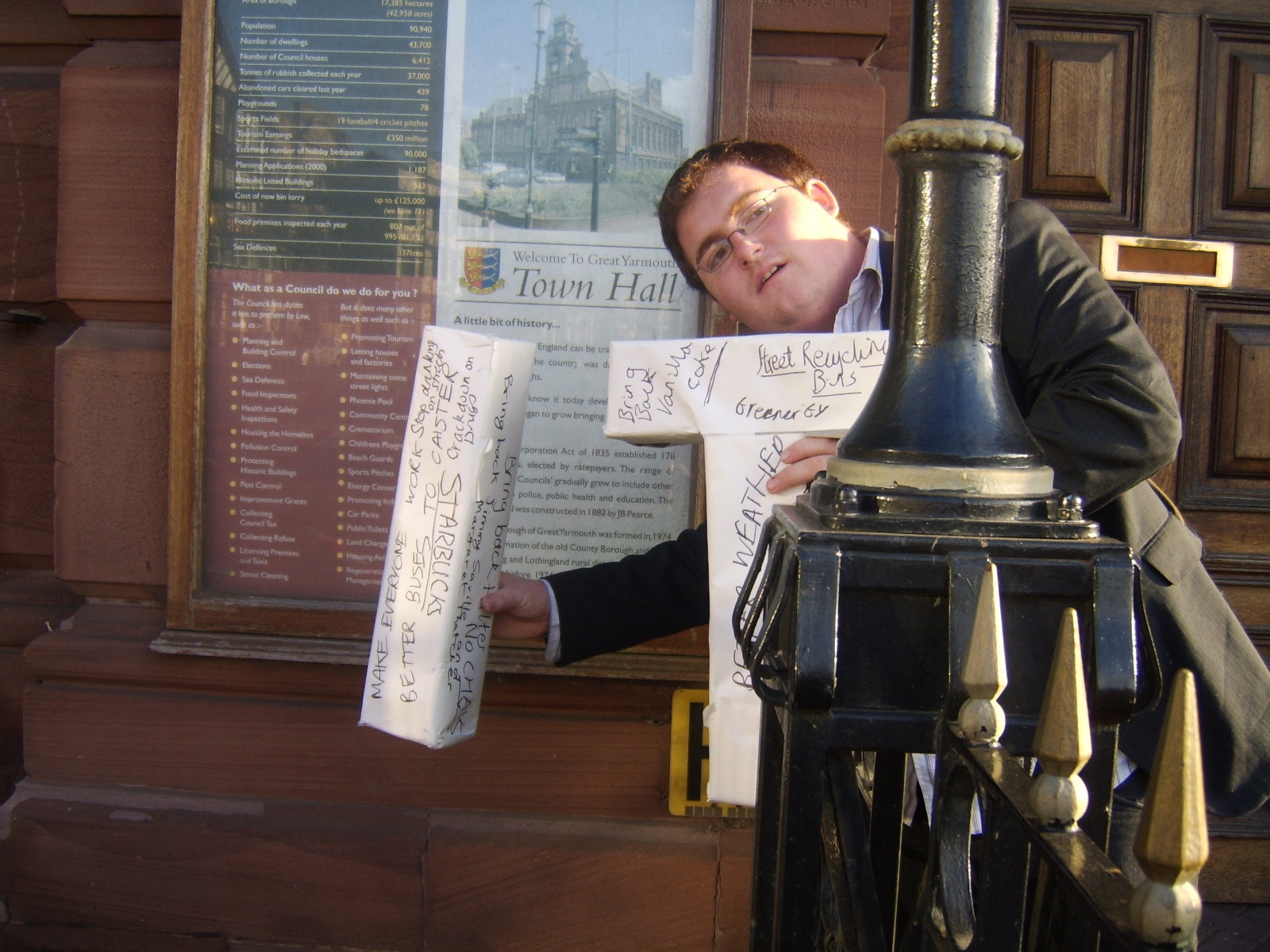 October 23rd, 2007 3:07 PMOn arrival, Mr. Smith met Tom, and took some publicity photos ready to go into his campaign trail. After a short wait, Mr. Forbes turned up, and Mr. Smith had a hint of the cunning plan revealed. Mr. Forbes was walking toward them carrying two large letters, which upon closer inspection turned out to be an 'I' and a 'T'. It was at this point Mr. Forbes and Tom decided to unveil their cunning plan to gain popularity in Great Yarmouth.