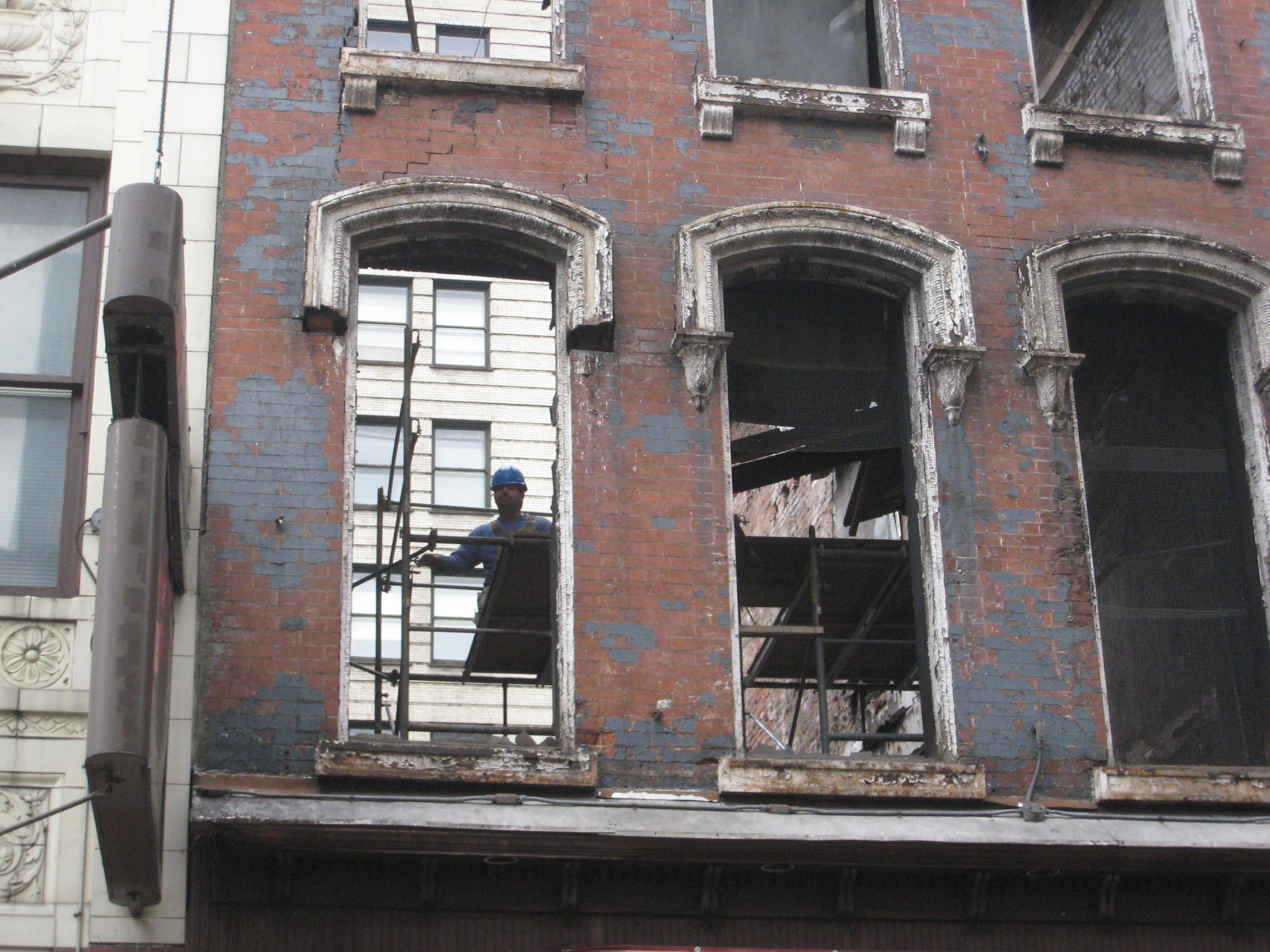 A block-deep construction site- through the windows of a hollowed out building one could see all the way past the workers to the next block's buildings.