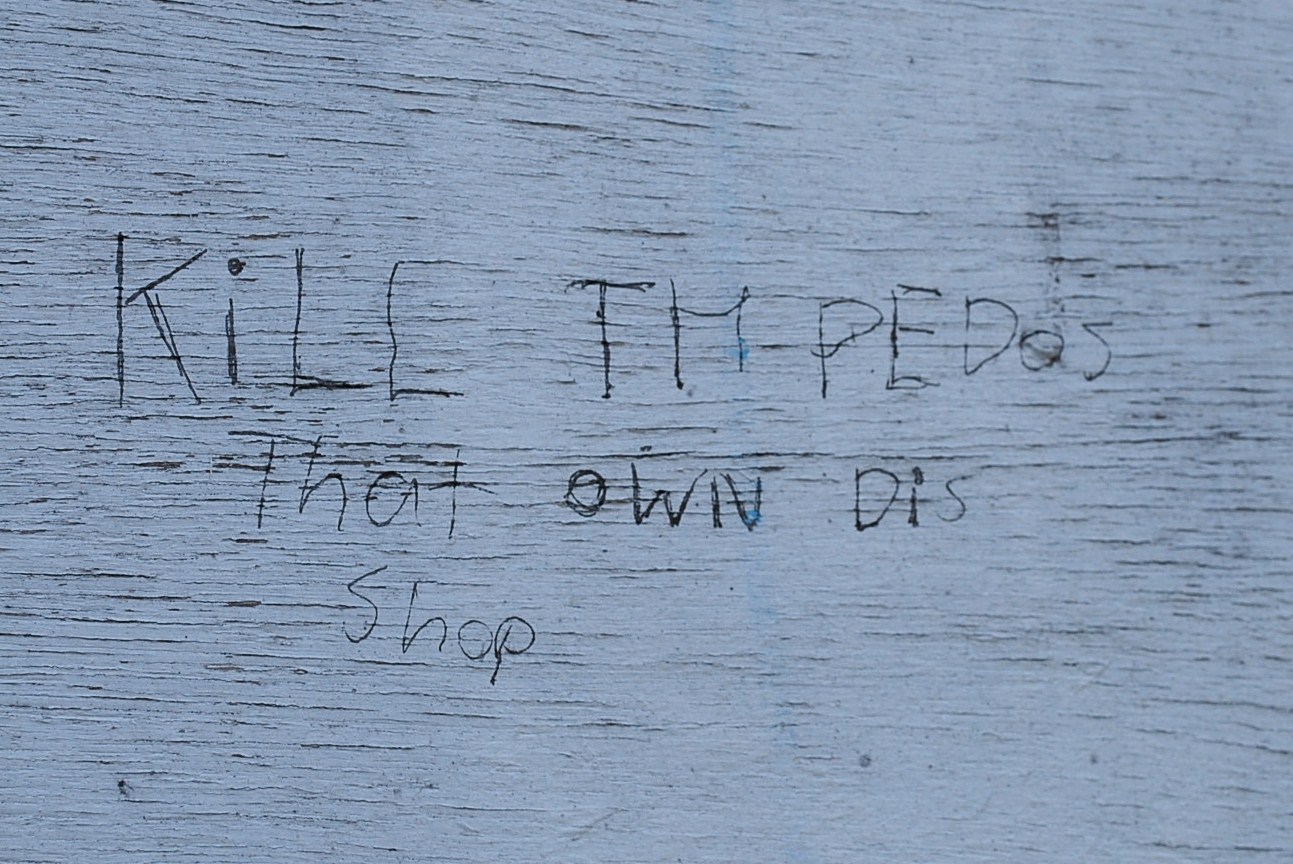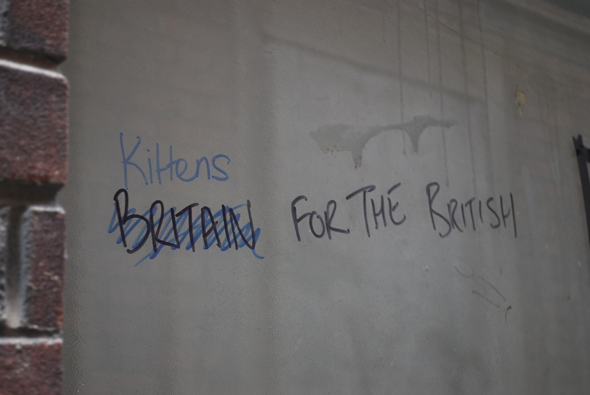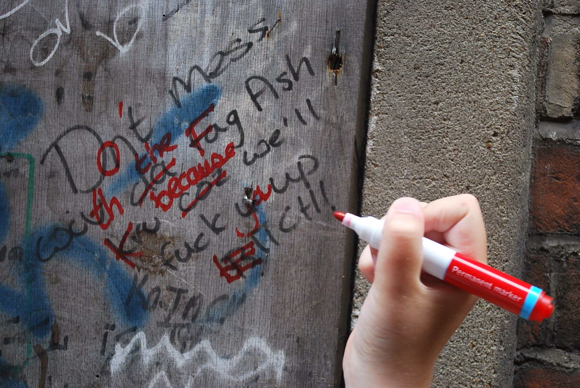 The following scribble had been bothering Adam for a long time now as it is on his way into town and he had to be reminded constantly of the narrow minded and ignorant population that make up a lot of the area. So, we made it better. =)