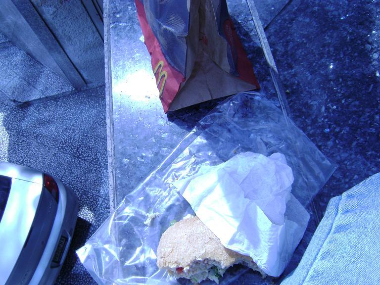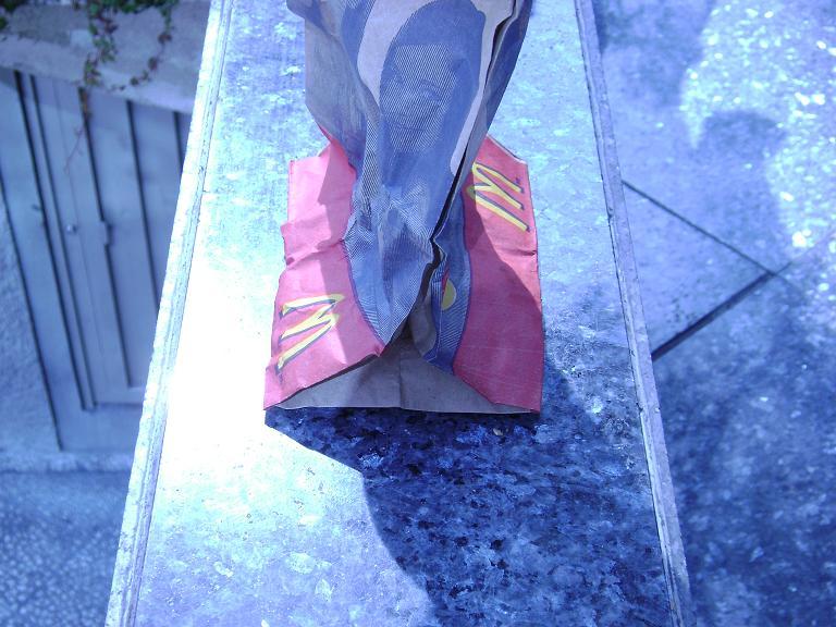 The actual glueing involved the use of a bottom-less Mc Donalds lunch bag that I would "forget" and that would be picked up by someone, unveiling the glued figure. The idea turned out to be very stupid and the lunch bag stayed there for almost an hour without eliciting anyone´s interest, so I had to unveil it myself.