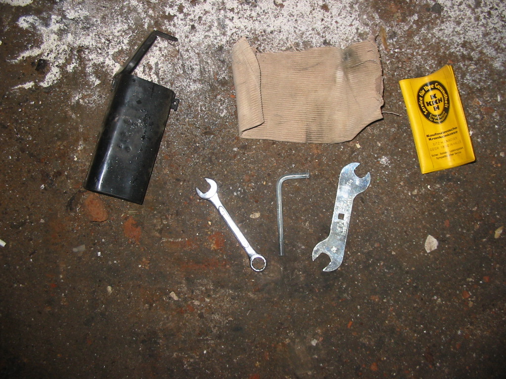 I also found these more recent-looking tools. They were all inside the black plastic case on the left when I found them, but here I have them spread out on the ground to give you a better look. The case was near the brush, close to the bottom of the heap.