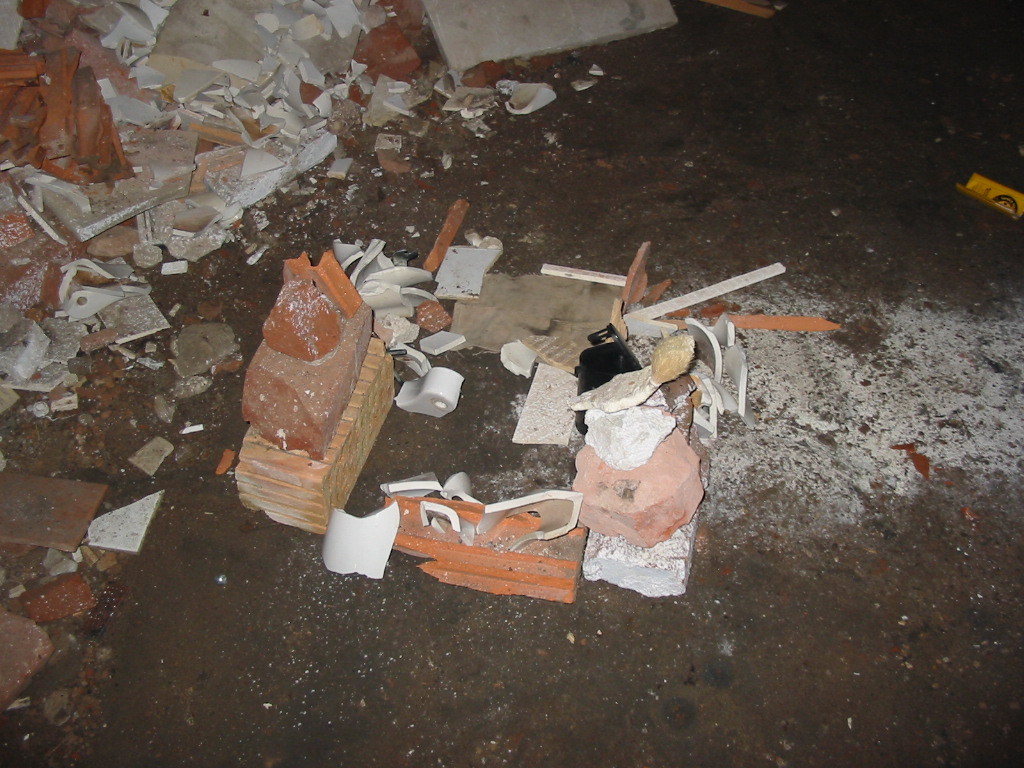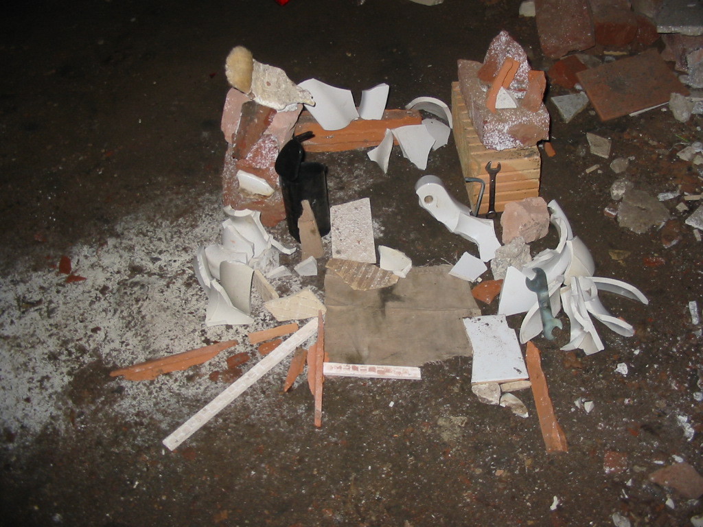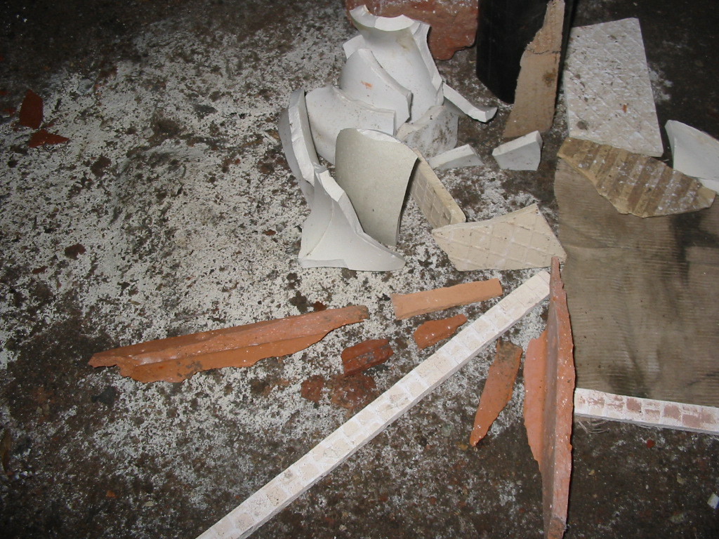 When I say “cave”, I do mean “cave”. It was clearly of natural origin, although some human accoutrements such as doors, stairs, and a fluorescent light had been added. The inside of the cave was about 20 degrees cooler than the outside temperature, which was quite pleasant, since it was an extremely hot day. It was relatively high-ceilinged, but there was only about as much floorspace as in a large bedroom. This was mostly taken up by a GINOURMOUS pile of debris: bricks, plaster, plastic, pieces of insulation foam, pieces of dried-up rubber cement, the broken bits of what might have been a toilet, and other assorted junk.