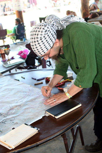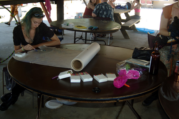 Tasking across a thousand miles, a year in planning, a dedicated online used bookstore hunt, an oversized roll of newsprint nicked from a newspaper office and duct taped to a suitcase in airline checked baggage, three boxes of crayons and several hours on a Burning Man Regional Event playa with the help of random strangers, we epically bring you approximately 384 square feet of the opening chapter of Finland's national epic: the Giant Kalevala Colouring Book. As translated from Children's Book English into less censored English, and LOLCat.