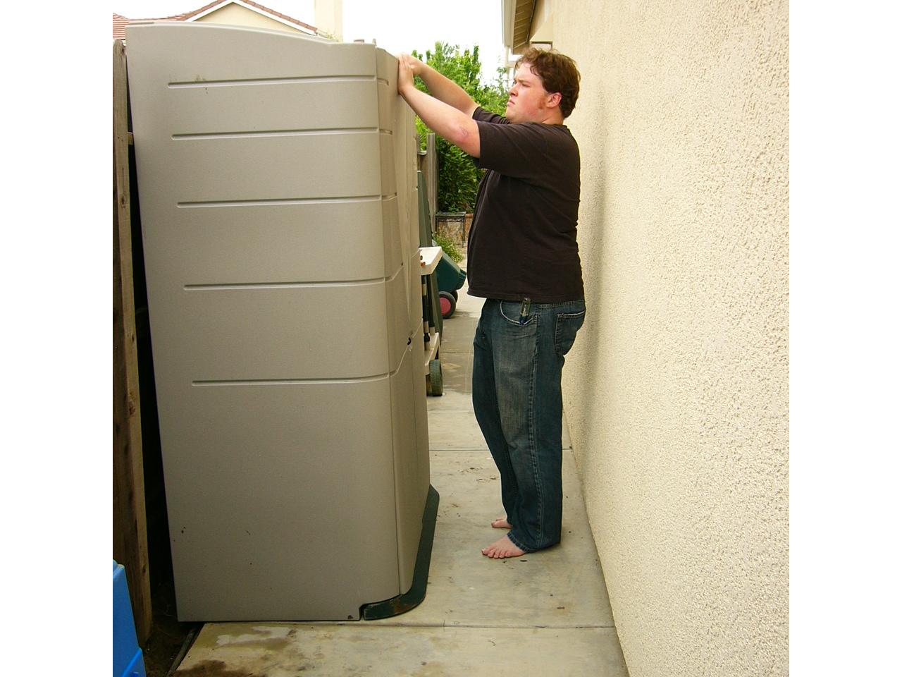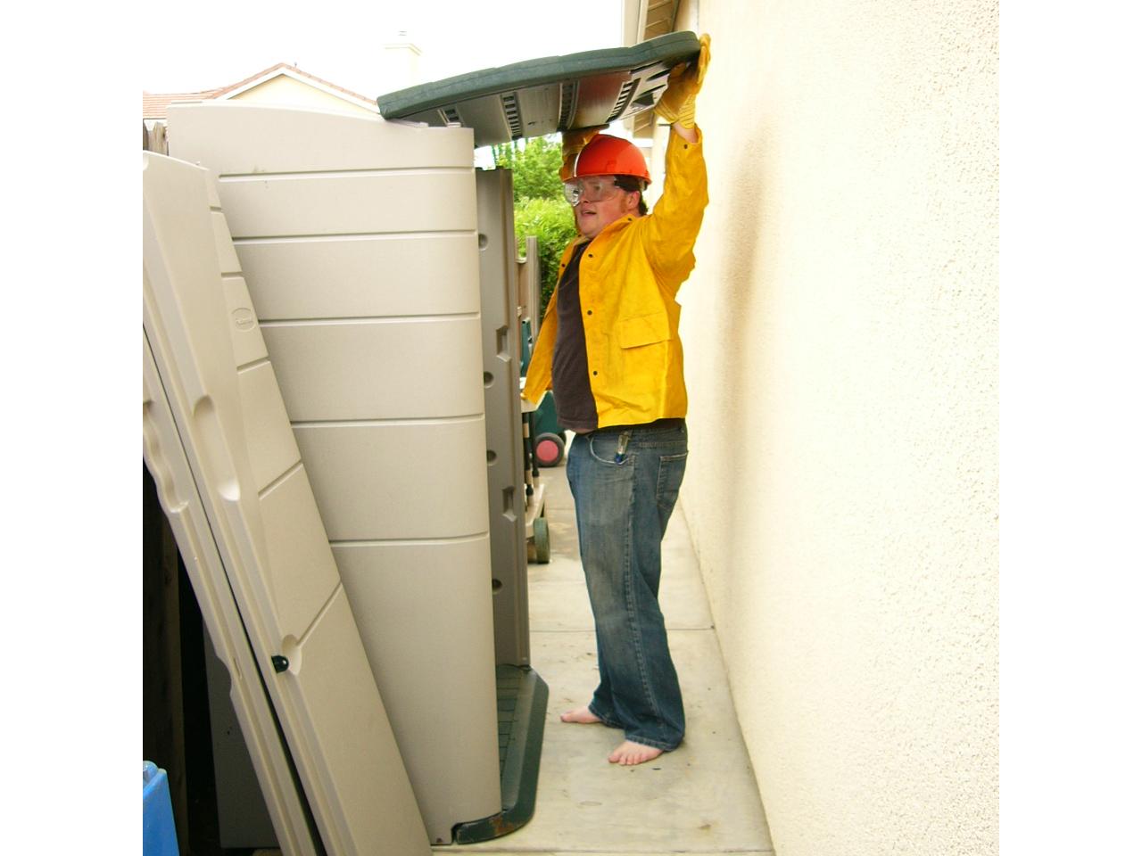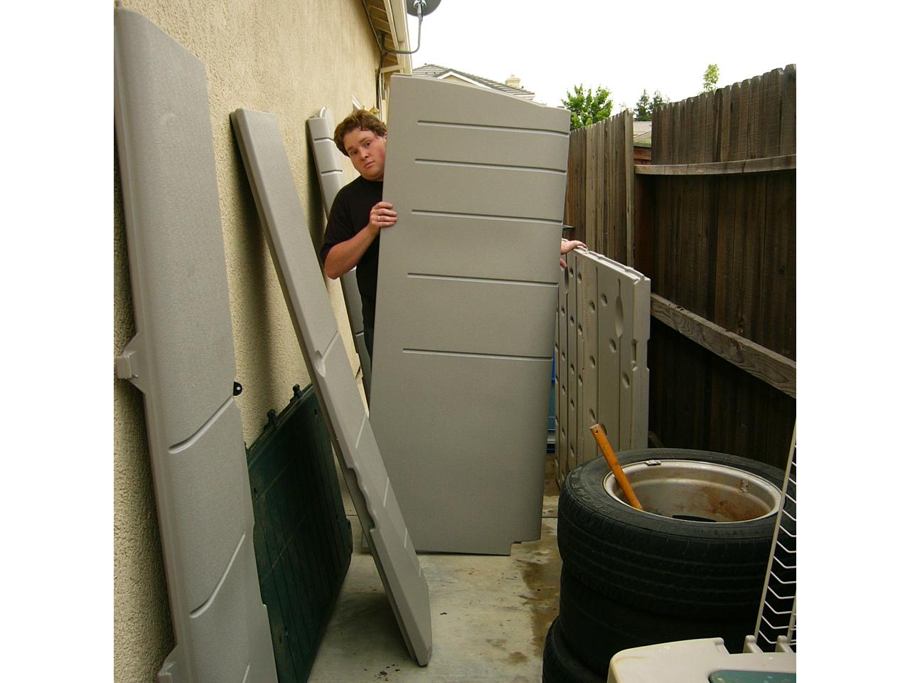 This shed is composed of 8 pieces of molded plastic that lock together. And no instructions. So it was like a great giant puzzle that kept trying to fall on me. I had a blast.