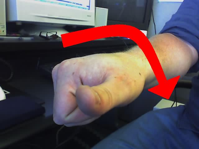 You put your hand out with closed fist horizontal to the ground, thumb pointing forward. Then you jab the thumb, and twist a quarter turn. This is especially formidable if you use both hands. All this is accomplished while keeping eye contact with the recipent, and holding a deadpan face without smiling. The implication is: Knock off whatever stupid shit you are doing, or I will jab out your eyes.