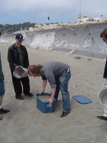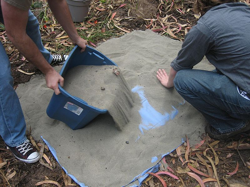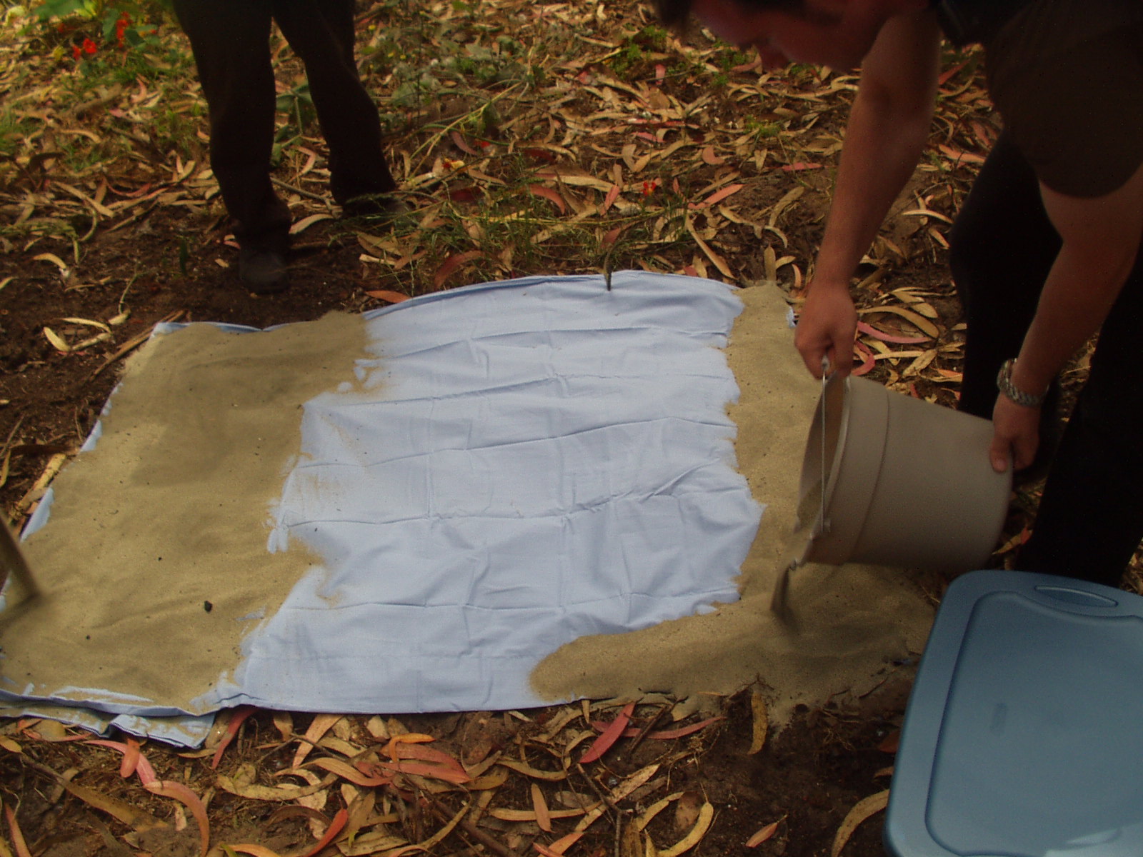 Sand was transported by bucket from the nearby beach, and the area was prepared with a special water absorbing barrier. Or it might have been a bedsheet, we just don't know... important science-type notes and observations were lost when the newly filled desert experienced it's first sand storm.