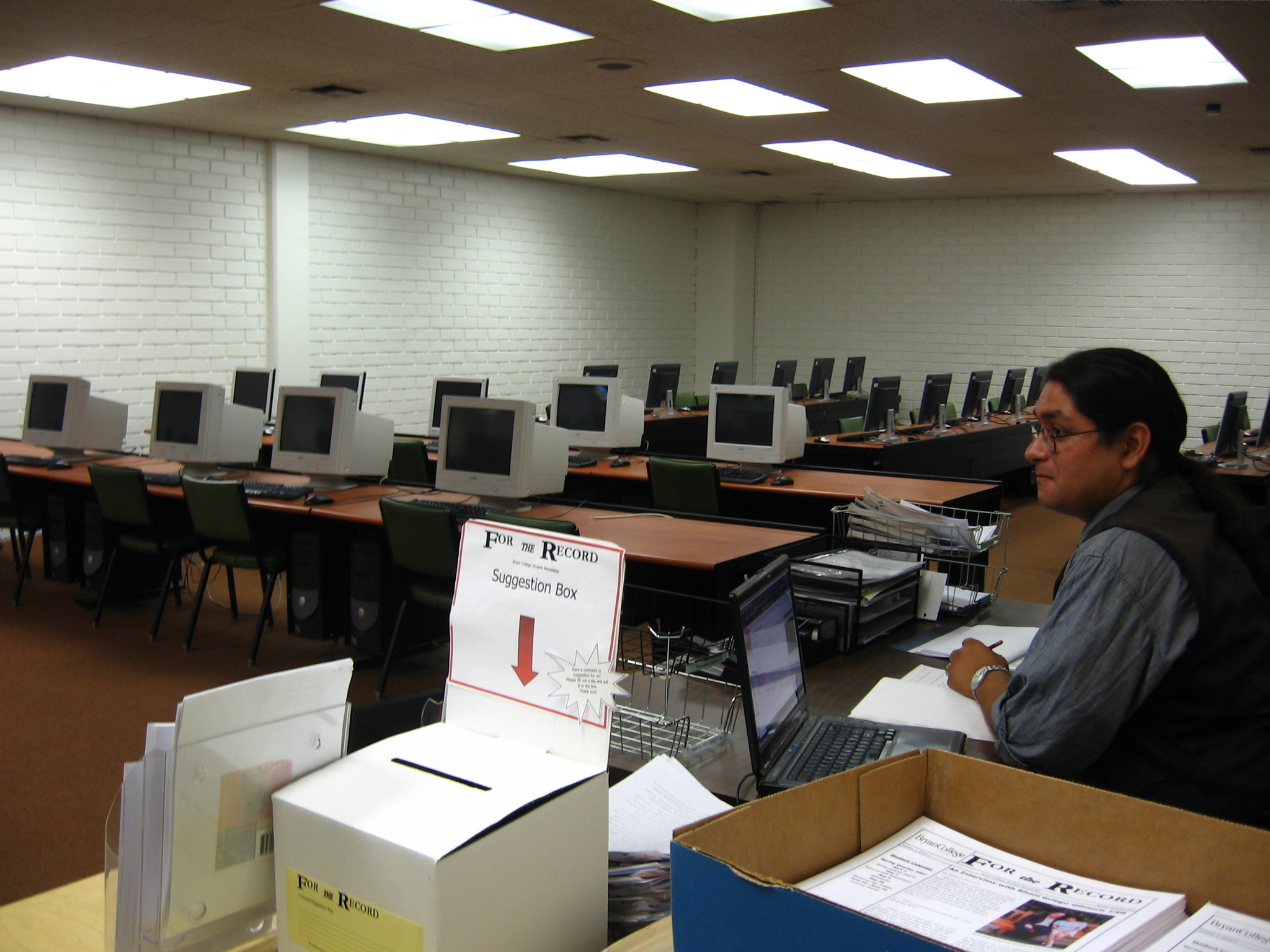 This is the computer lab where we type up all of our tests. The man is my husband, C.M. This is his domain.