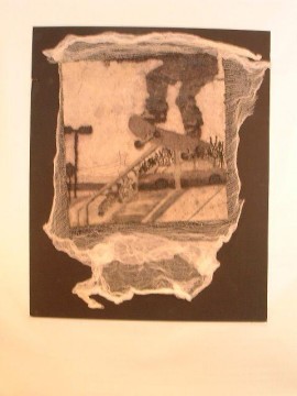 this entire thing is made out of wet paper pulp stuck on cheese cloth. the paper pulp is dyed with dilluted variations of black india ink. in only 5 or 6 shades. the fine lines are done with string. of course it dries and is one piece of super thick paper.