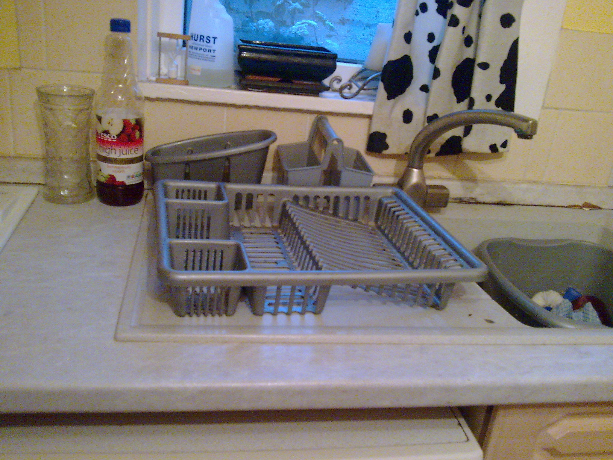 view my crockery, washing up liquid, scrubbing brush and tea towel. also view the cool pirate ship behind me yaaarrrr!!!