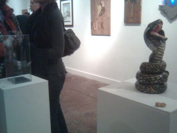 Two Buck Tuesday is a monthly event at Kaleid gallery that incorporates demonstrations, music, food, quirky speakers, live drawing, and small artworks by local artists for $2. This month, the speakers included a guy who used to do remote viewing for the CIA. Moose and Saturday were the only peanut facilitators in attendance, but they were more than sufficient. One guy who goes to all the art events and tries to sell people "End Your Feulish Ways" stickers, upon noticing the peanuts, started going around eating them. Their widows were given a stipend and a medal in commemoration of these fallen heroes. I noticed that Lacey, one of the organizers of TBT and the cashier, had one of the original peanuts with faces on them in her art box. I don't remember whether that was me or Eir Daintiness.