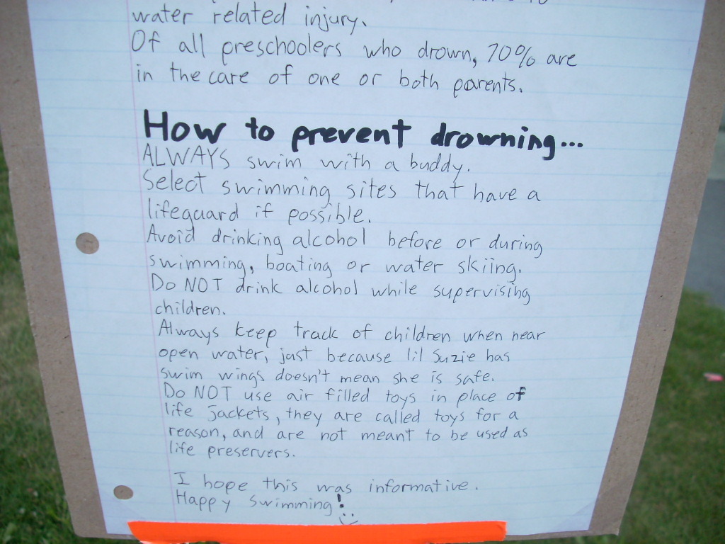 Well I was looking at the "Kids don't Float" sign and noticed a significant lack of drowning information therein. So I researched and wrote down some statistics and prevention information on drowning and posted them Right below the sign nest to the life vests.