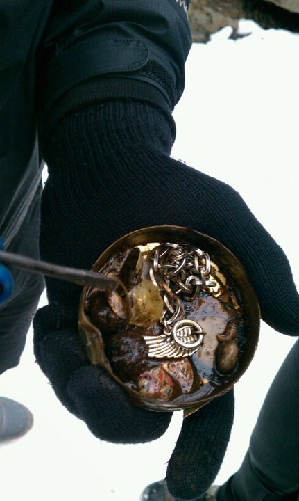 We quickly dug around the rest of the object, and victoriously pulled out the tin. A couple watching from the bridge above us cheered as we all yelled and jumped on seeing the booty. We cleared out of the area before opening the tin, but closed it again pretty quickly when we discovered that the inside was full of slime, as well as a couple of maggots. However, we were able to wash the treasure when we got home, and it's now composed as a small shrine in a corner of The Lottery Fortress.