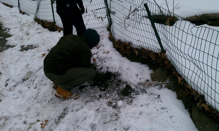 Finally, we found the curved section of fence where the treasure was buried, which we identified by the rock outcropping between the path and the fence. We knew it was within five feet or so of these rocks. However, this turned out to be the most difficult part of the task. While we knew that it was within that area, it was hard to tell the exact spot the tin had been buried in from the perspective of the photographs. We spent a good twenty minutes digging around and trying to orient ourselves, but we started to worry that the tin had been found by non-players or washed away in the rain.