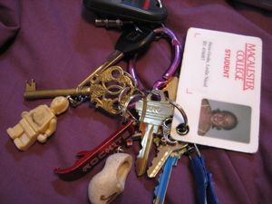 -Keys to house, car, bike lock, handcuffs, house in NC, fancy key from Spain that opens nothing, with Rockits, C3PO, and Amsterdam shoe keychains