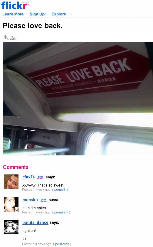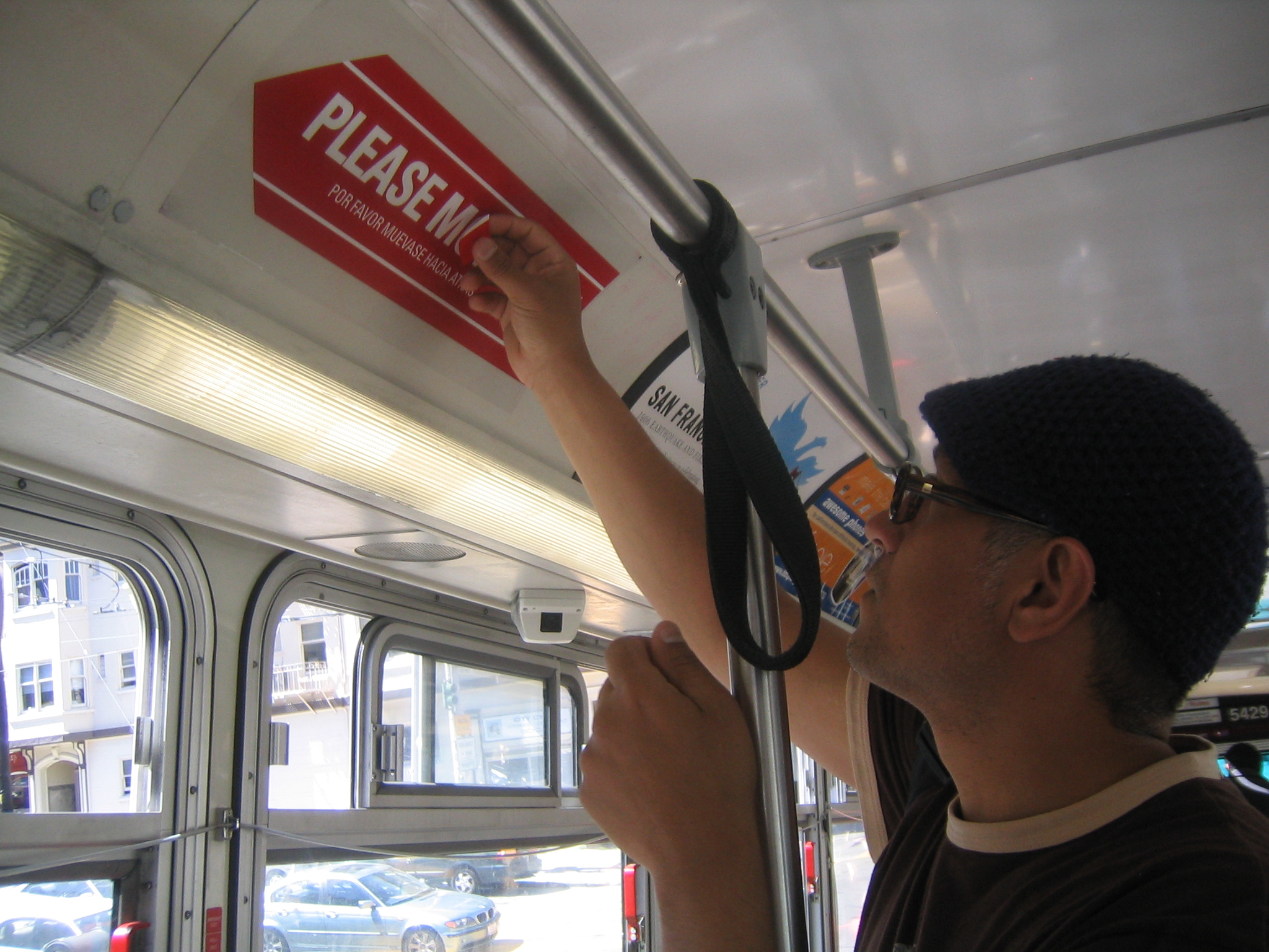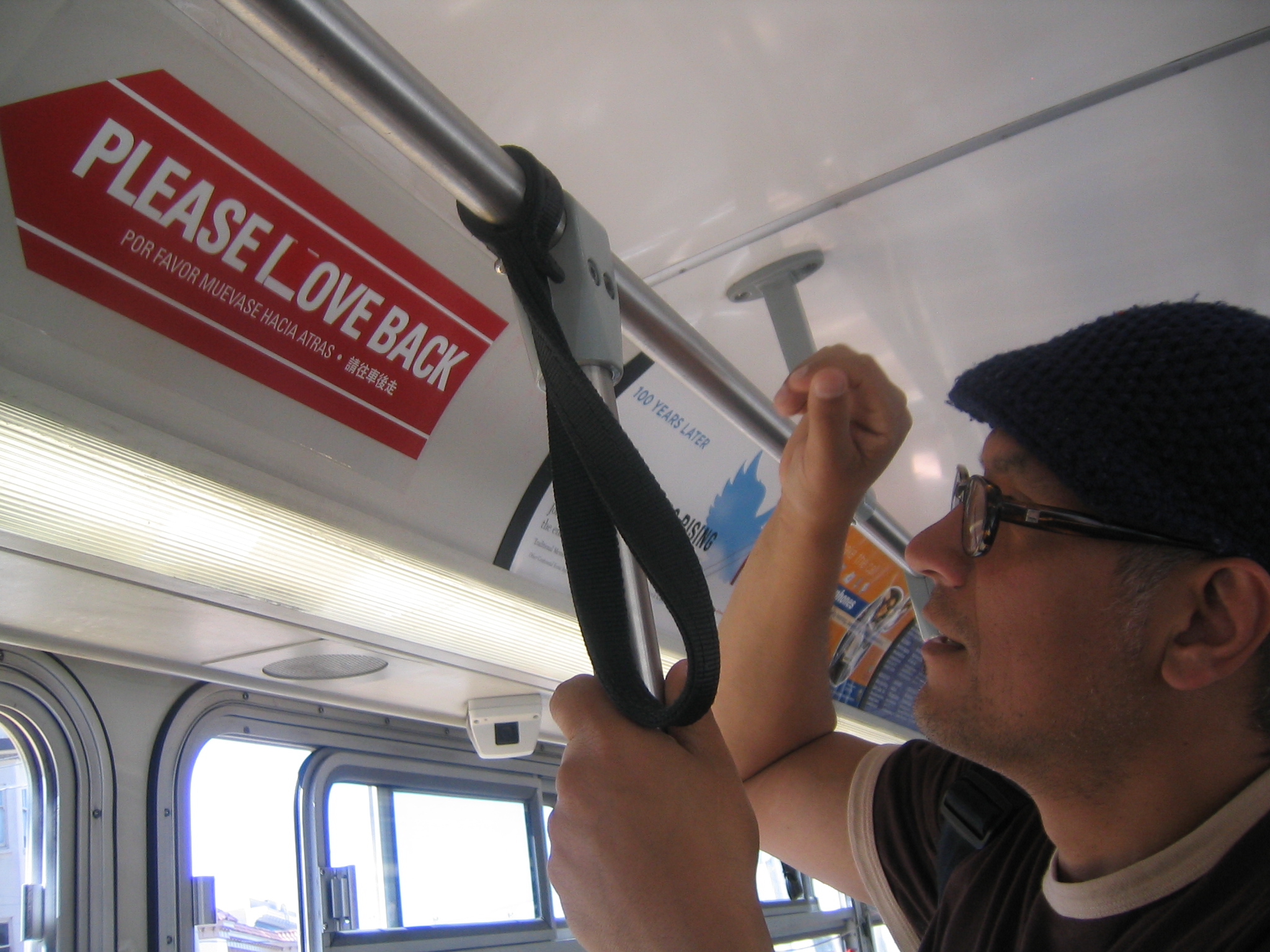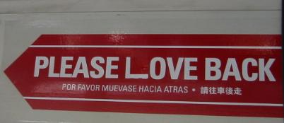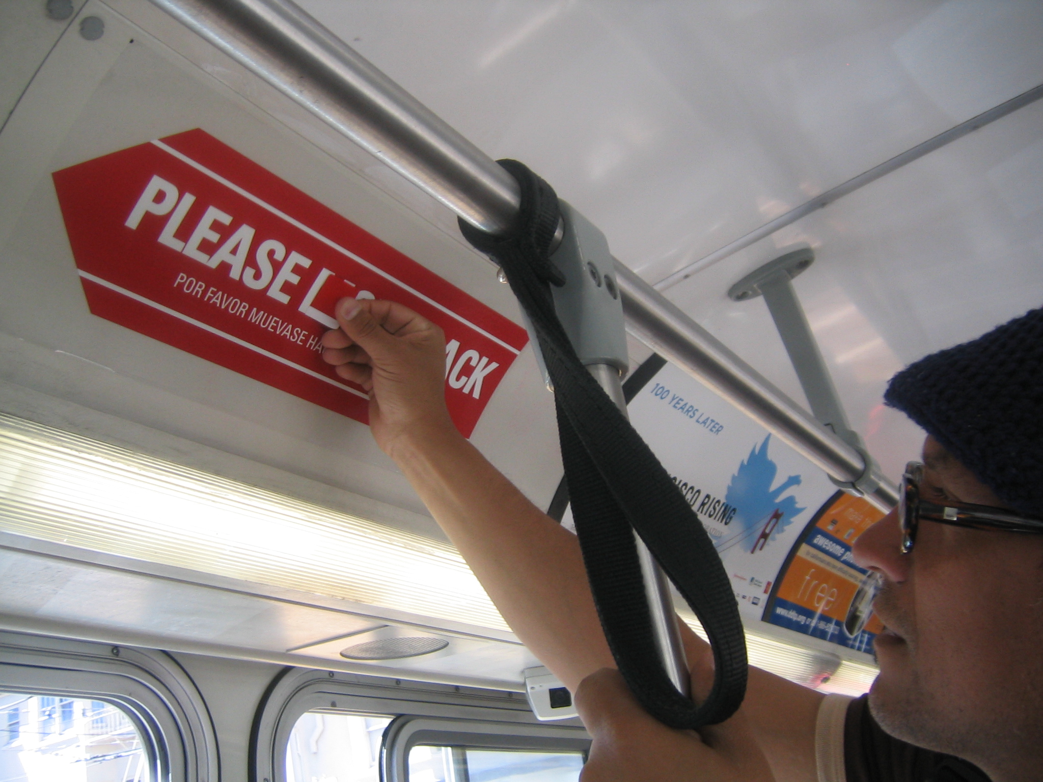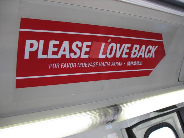 Lina and I got on the 71 on Market. After eyeing the sign on the wall ad space thing, and in my hand, I started to doubt that I had gotten the size right, Lina was sharing this thought. I wanted to try any how, pulled off the paper on the back, lined it up, slapped it on. Perfect! Works so well. The only down side was the space between Please and Love doesn't match up with Love and Back, but oh well, can't win them all. Got off, jumped onto the 9 (Number nine, number nine, number nine), it was not Lina's turn.