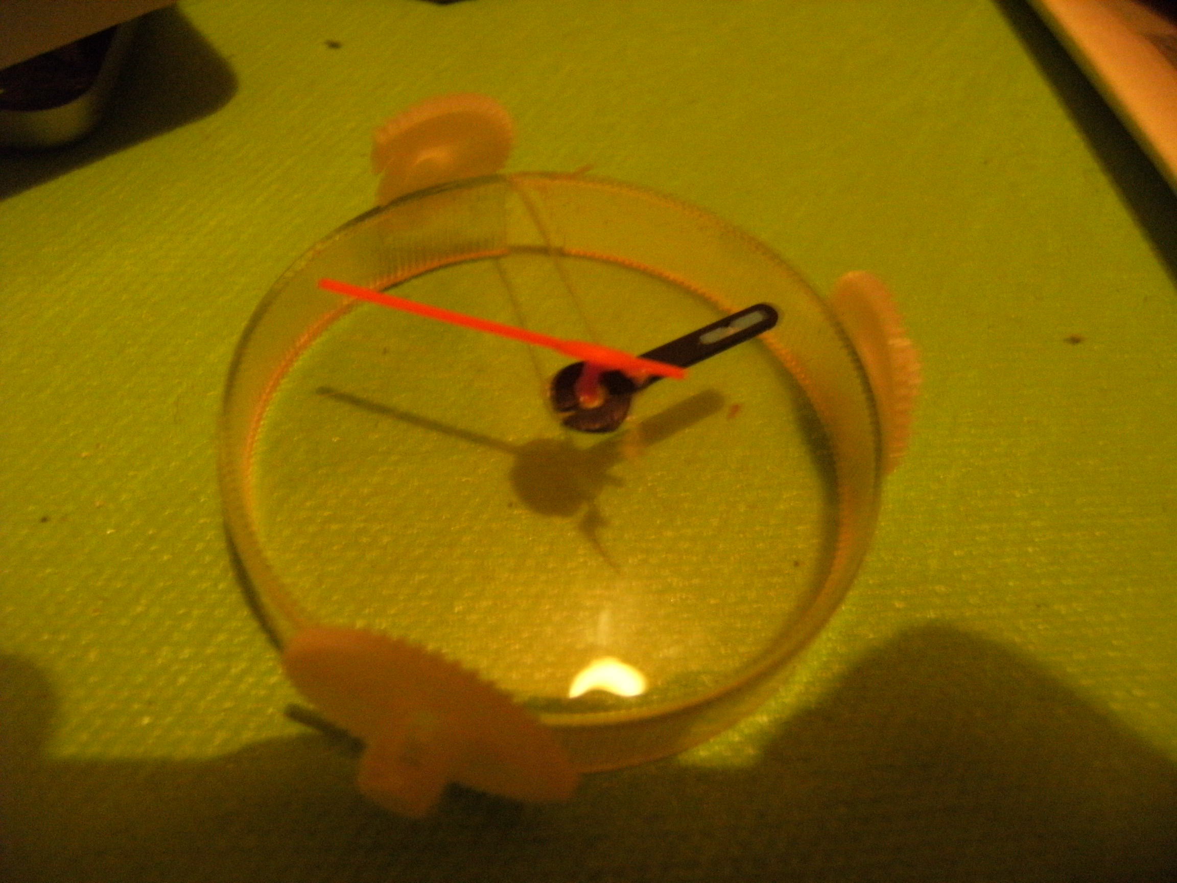 Then the smaller ones. These were made by gluing various clock pieces to the clear face covering from the smaller clocks. I mounted one of these, and the other lays down and rests on the gears that surround it.