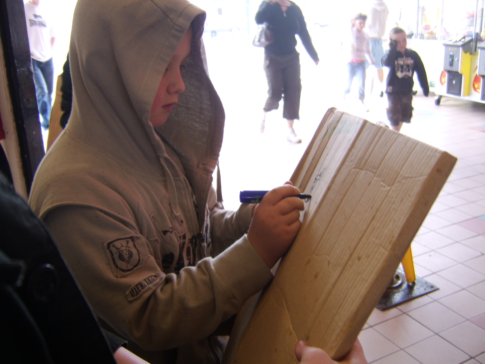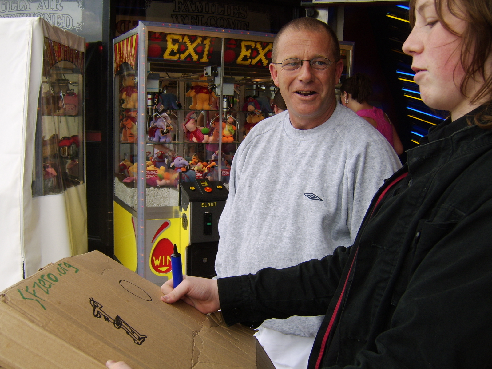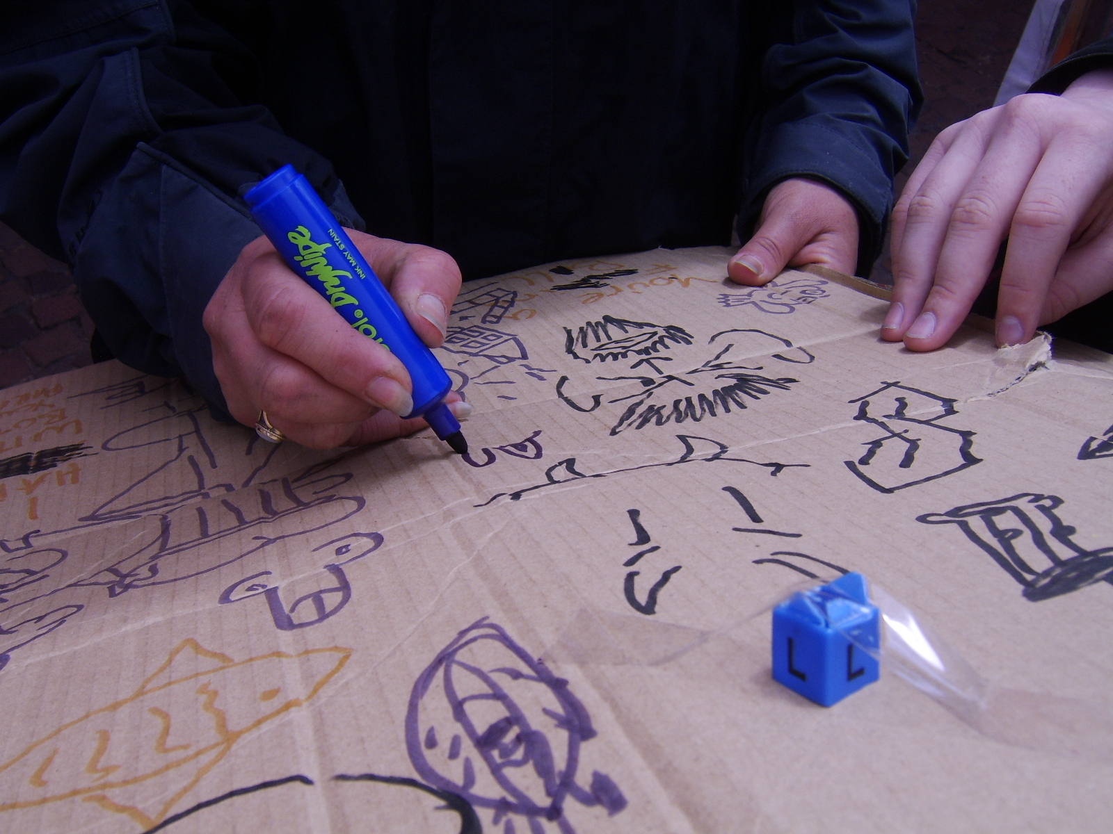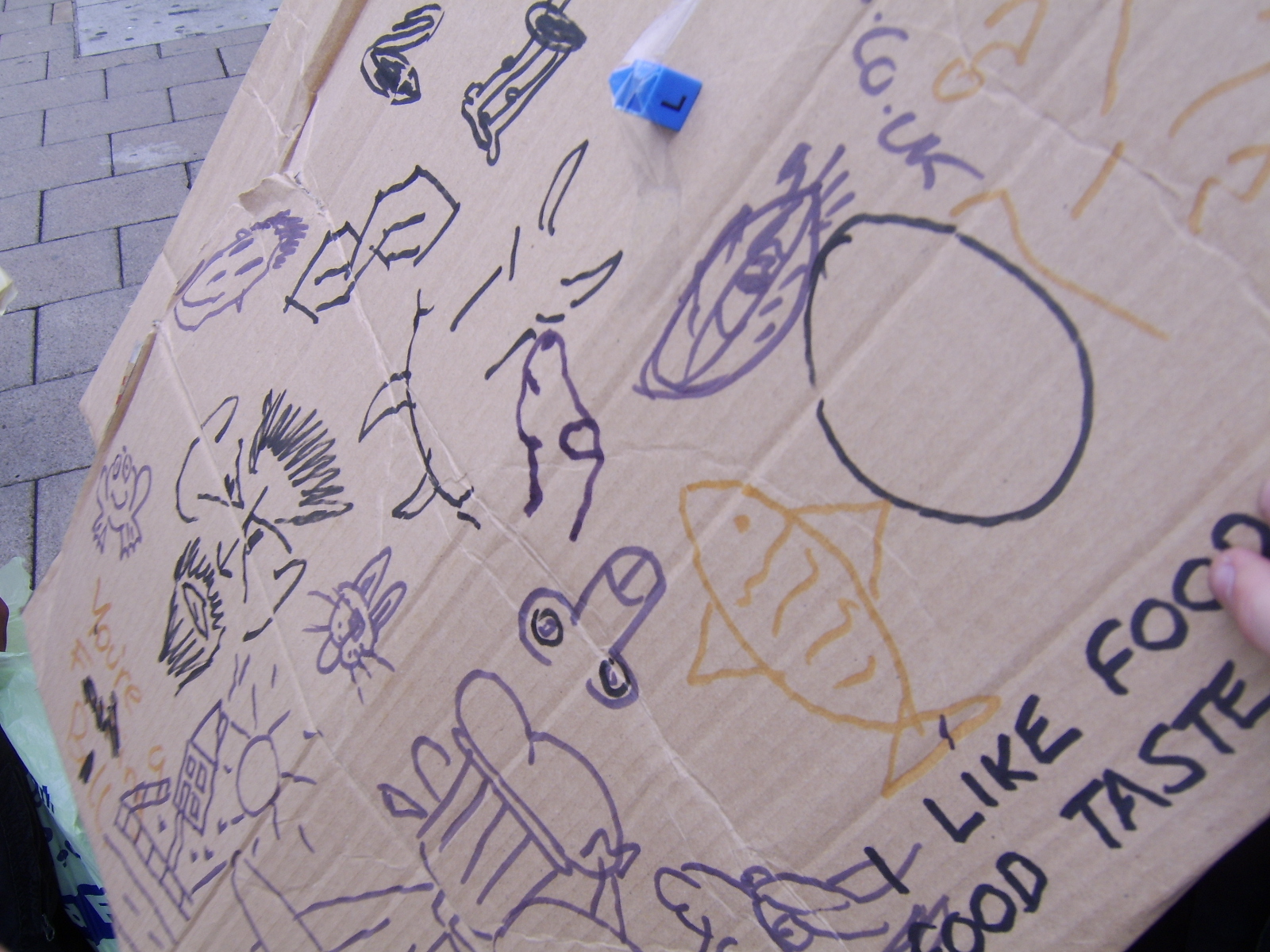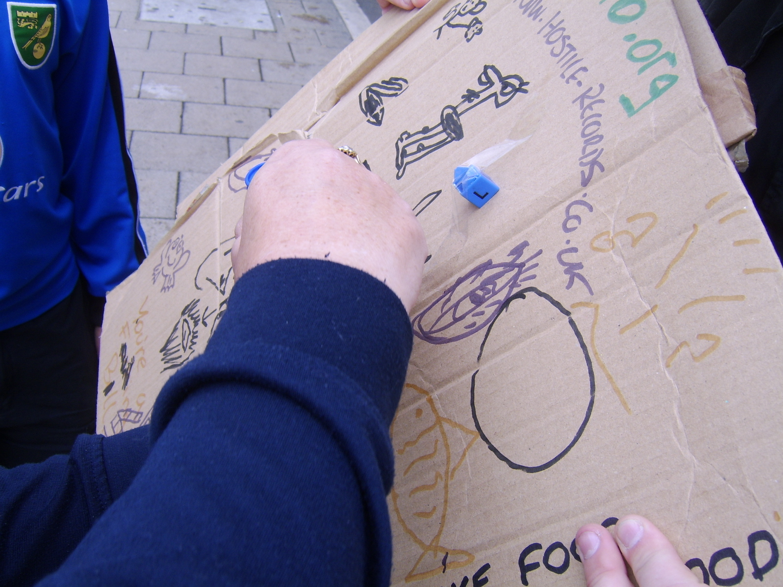 It was a rainy day, having just completed the rain dance task (and having it work!), and we took shelter from the rain under Britannia Pier. We were not the only people to have this brainwave, so our time under shelter proved well spent, getting our first 6 or 7 artists, including an entire family who seemed intrested in the game. Several small doodles were added, and an unsure person just added a circle. It was under Britannia Pier that we got our most artistic addition of the day, coming from a man selling hotdogs.