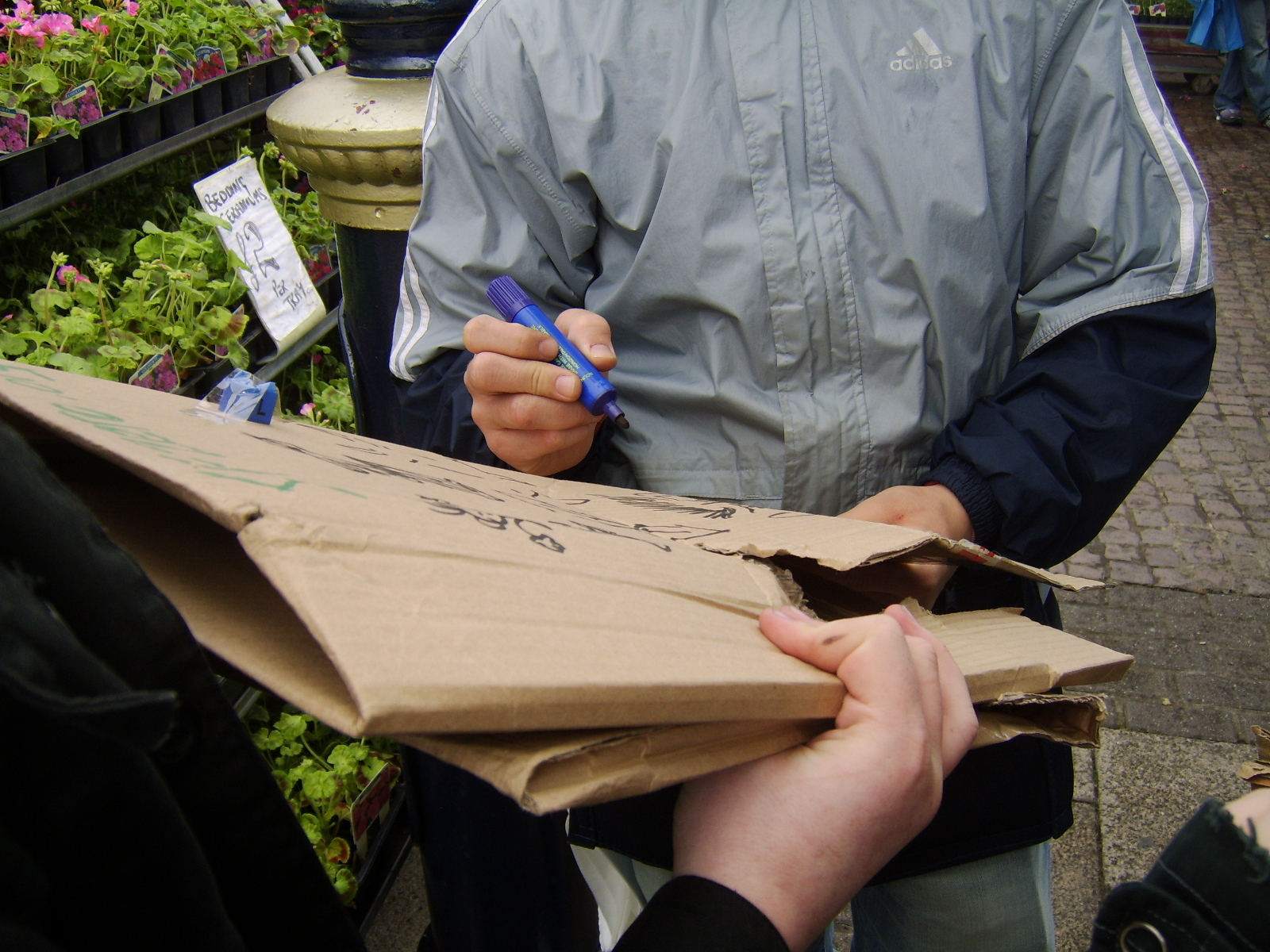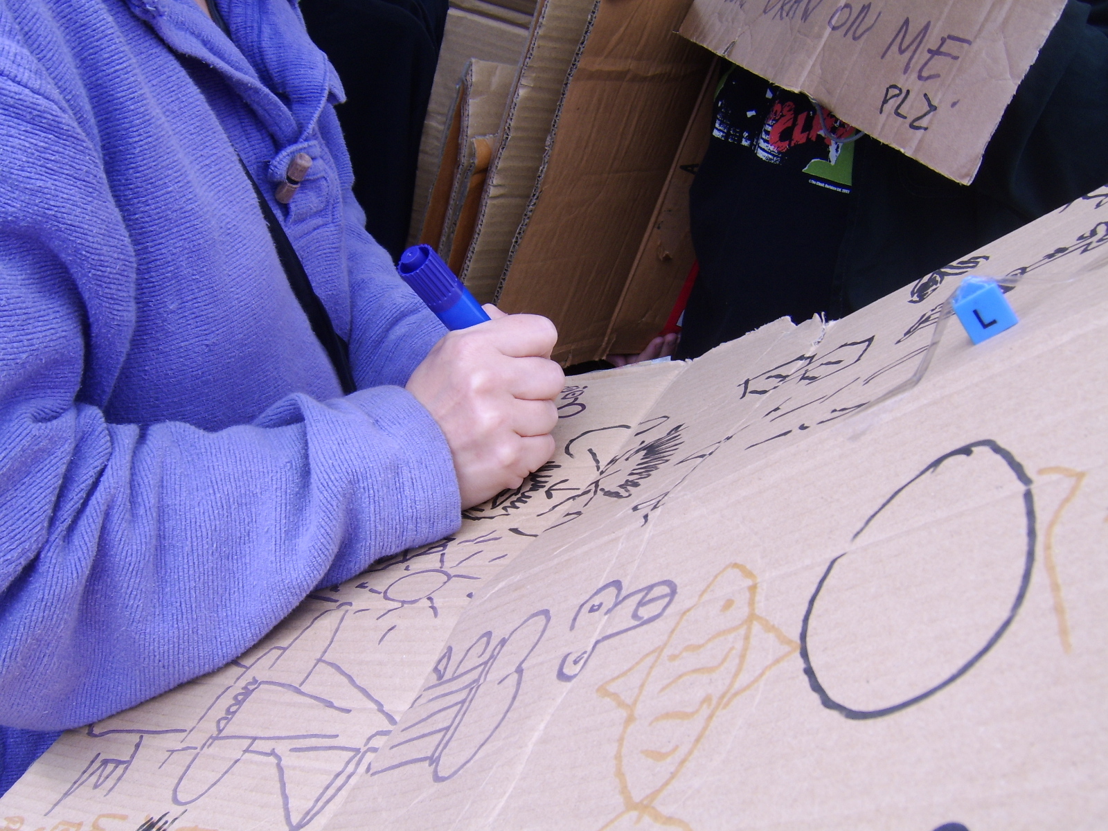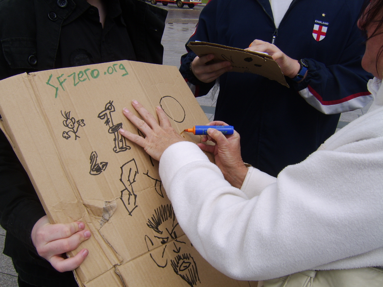 Once the rain had cleared up we headed off down the main 'tourist' street, Regent Road. Brandishing our easel and our sign inviting others to 'draw on me', we got a few people to add to the 'canvas' but most people were eager to get home because of the rain.